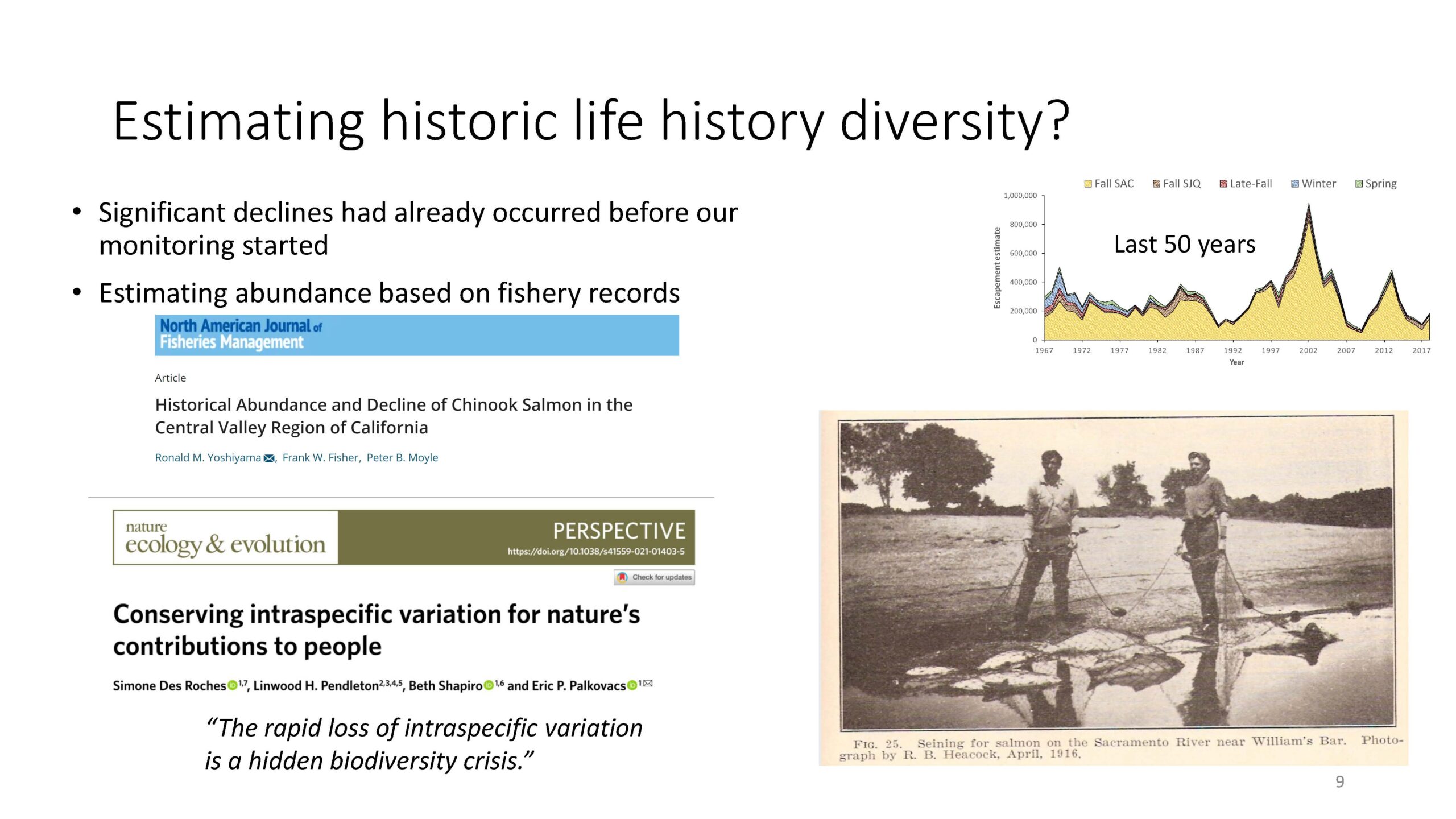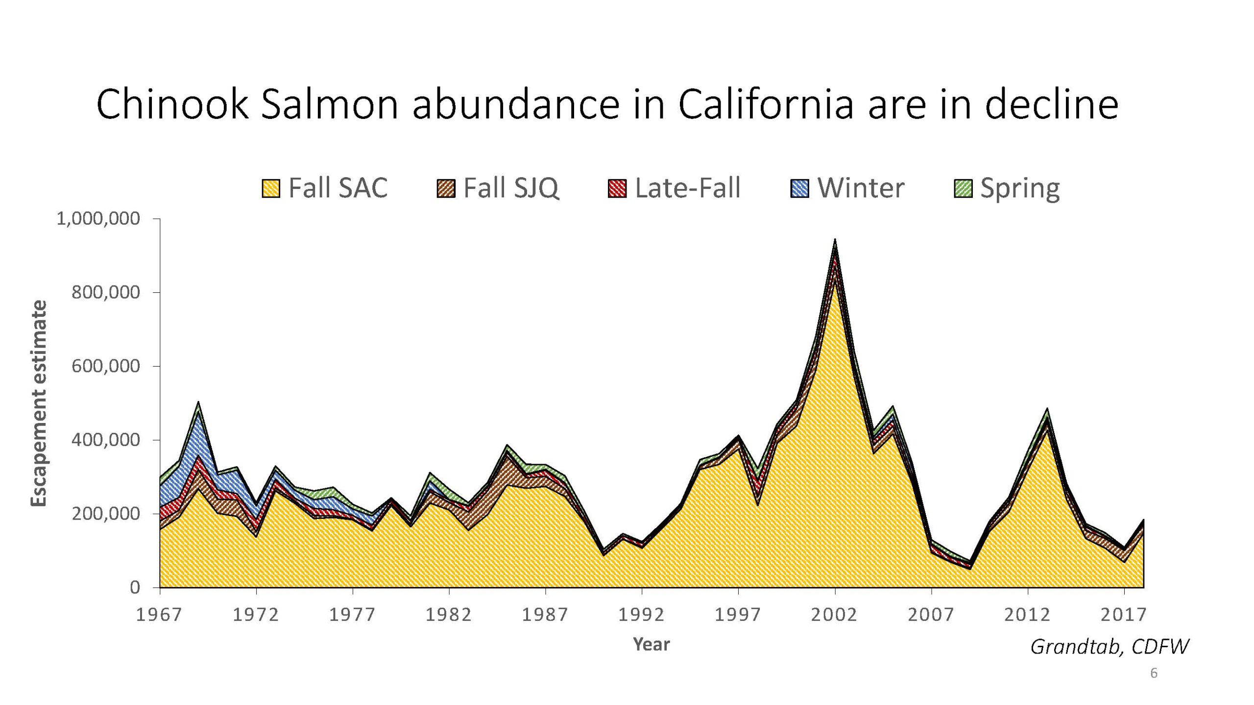 Chinook salmon have been part of the Central Valley watersheds for the last 10,000 years or longer, but our detailed monitoring only covers the past 50 years. Papers have been published that look into historical records, such as fishery reports, that show a long history of native fishing for salmon. And after the colonization of California, there was commercial fishing in the Delta and, later on, in the ocean.