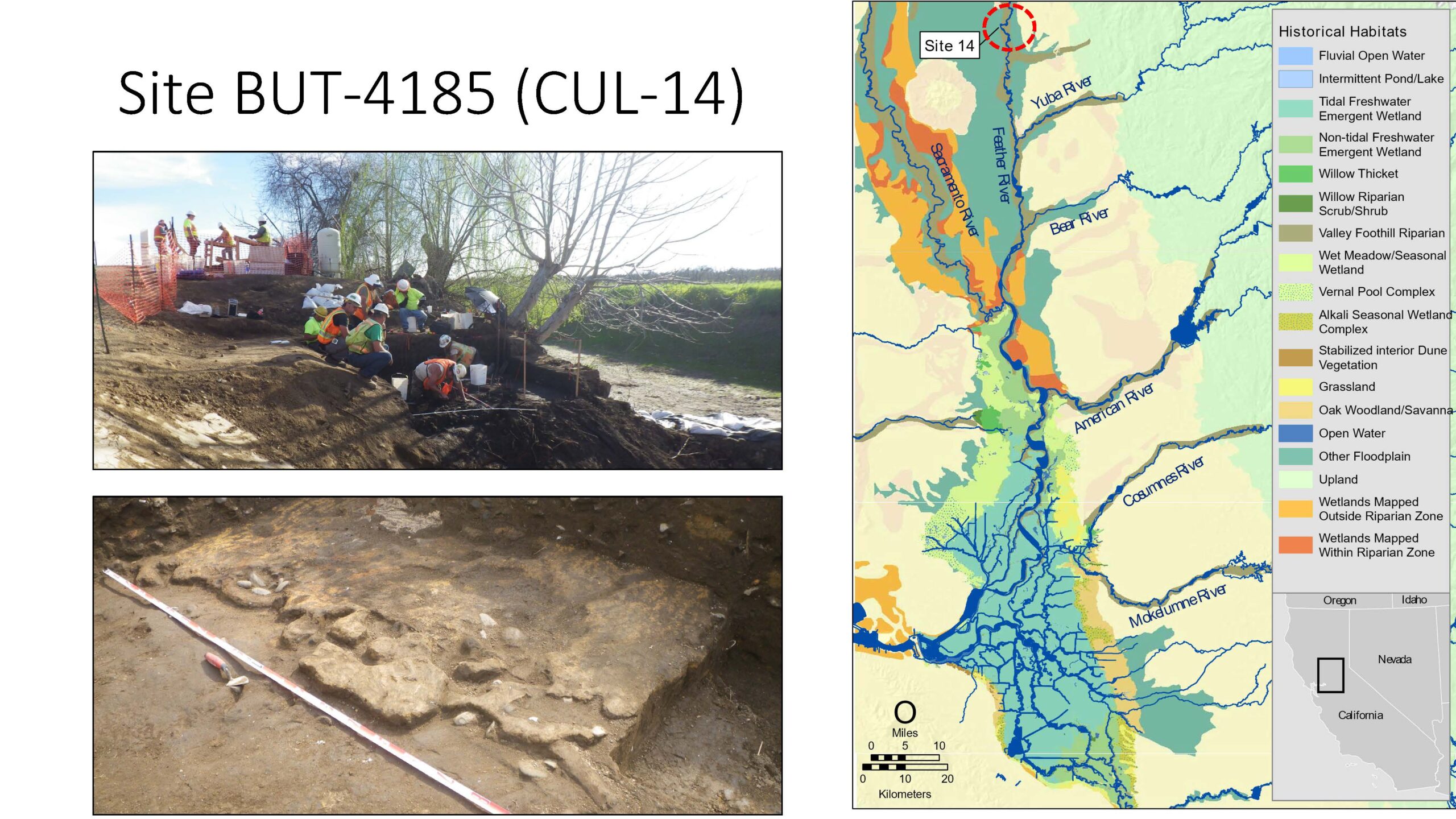 The archaeological site, a Maidu village dated to the mid-1800s, is located on the Lower Feather River near the town of Gridley and upstream of the confluence with the Yuba River. The mid-1800s was a time of intense change in California, with the Gold Rush bringing 300,000 people into the state. Mining practices at the time caused rapid changes to the watersheds, such as hydraulic mining drastically increasing sediment loads in rivers. The climate was also much wetter, with several large flooding events.