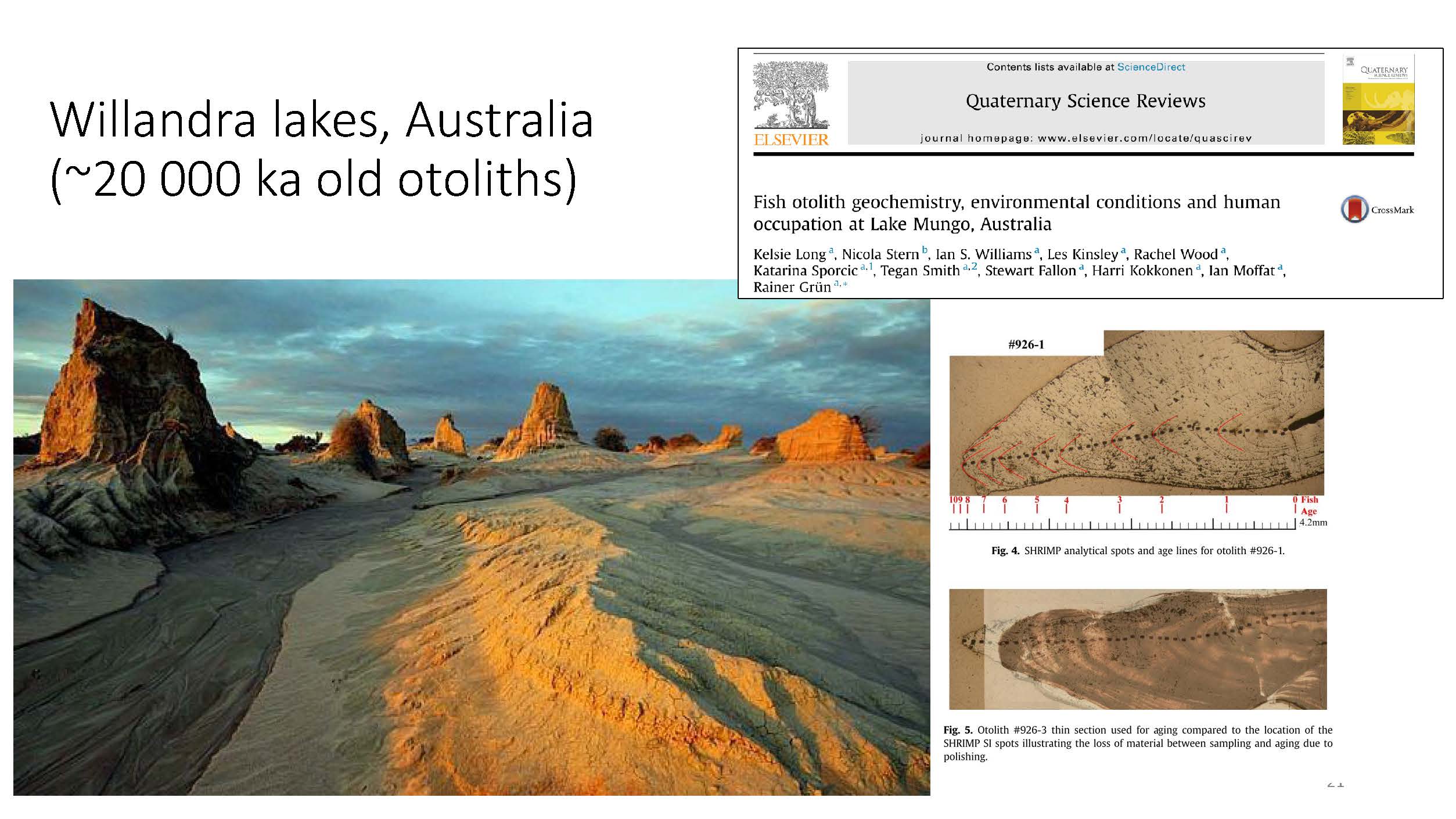 Another example is a set from the Willandra Lakes, a dry lake bed in Australia, shown on the upper right. Otoliths over 20,000 years old were recovered here in pristine conditions and were very well preserved. This illustrates that time alone doesn’t always predict how well preserved the sample is; it also means each otolith must be assessed on a sample-by-sample basis.