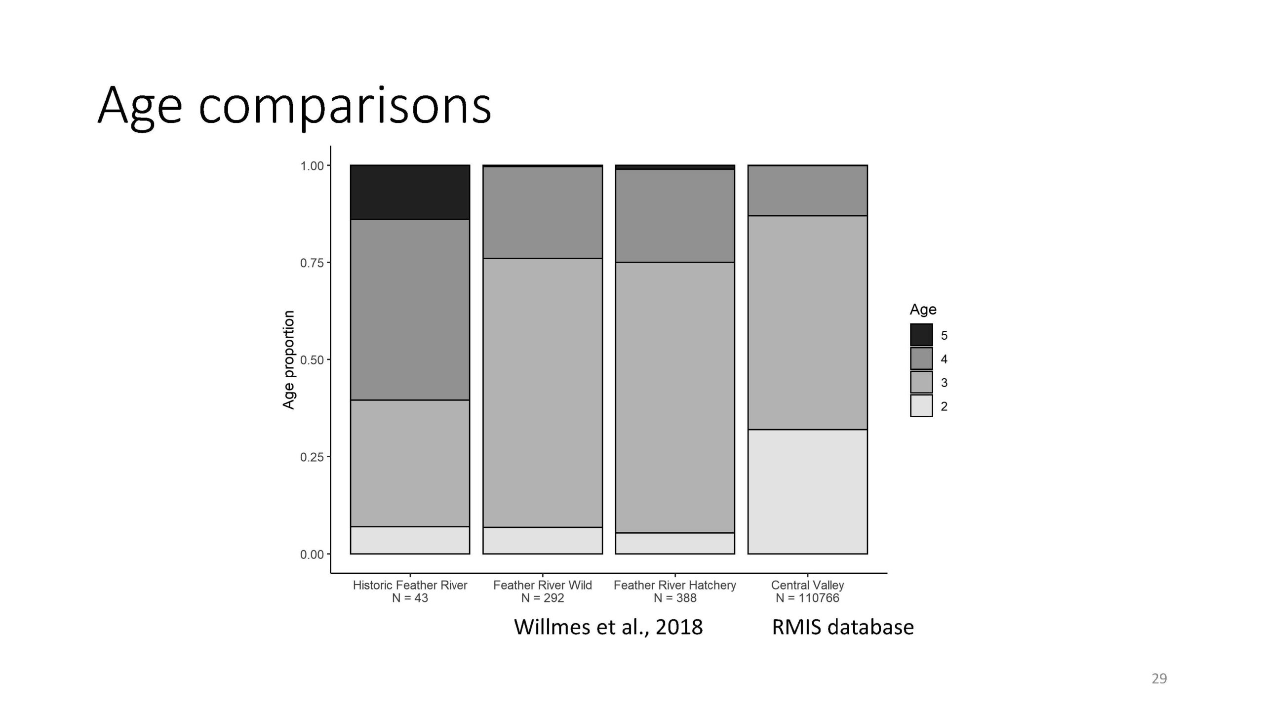 In this comparison, both in contrast with local watersheds as well as wider Central Valley, the historic samples had a much wider age distribution with a lot more four or five-year-old fish.