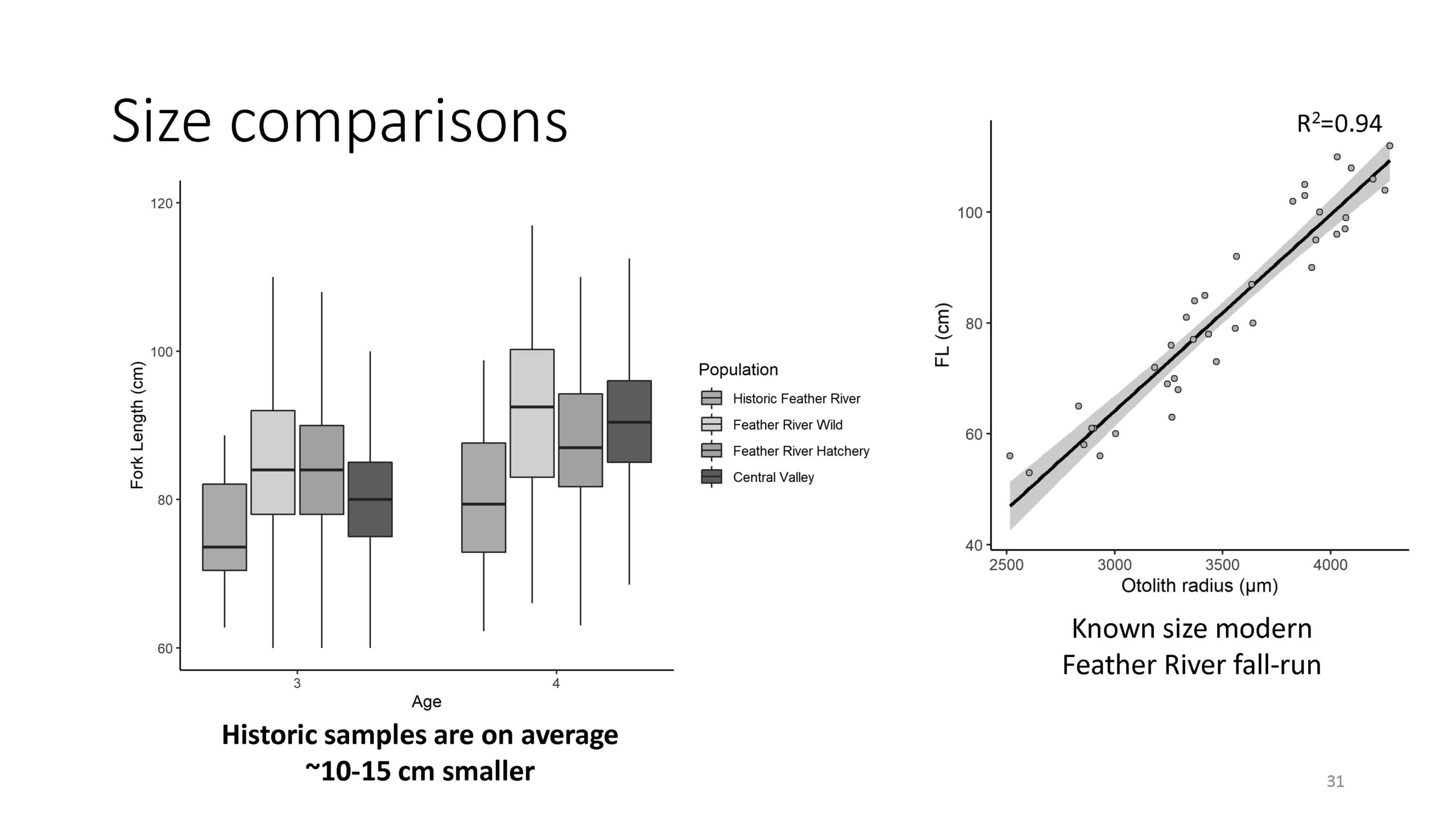 Next, the researchers wanted to reconstruct fish sizes based on the otoliths. Dr. Willmes said there is a species-specific allometric relationship between the growth of an otolith and the somatic growth of fish, but it can vary between species and even within species. So using the Feather River study, they constructed a linear model that they applied to their historic otoliths.