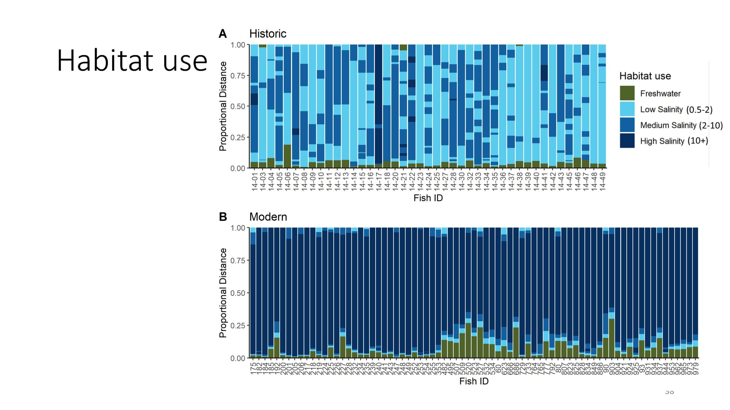 Finally, the researchers looked at lifetime habitat use, focusing on what happened to the fish as they moved out of the freshwater system. Each bar or column on these graphs represents an individual fish with the y axis representing their entire life; the numbers express the proportional distance from the core of the otolith to the edge. The colors represent different habitats. He noted the high salinity habitat is capped at 10 PSU, which is the resolution limit of the tracer.