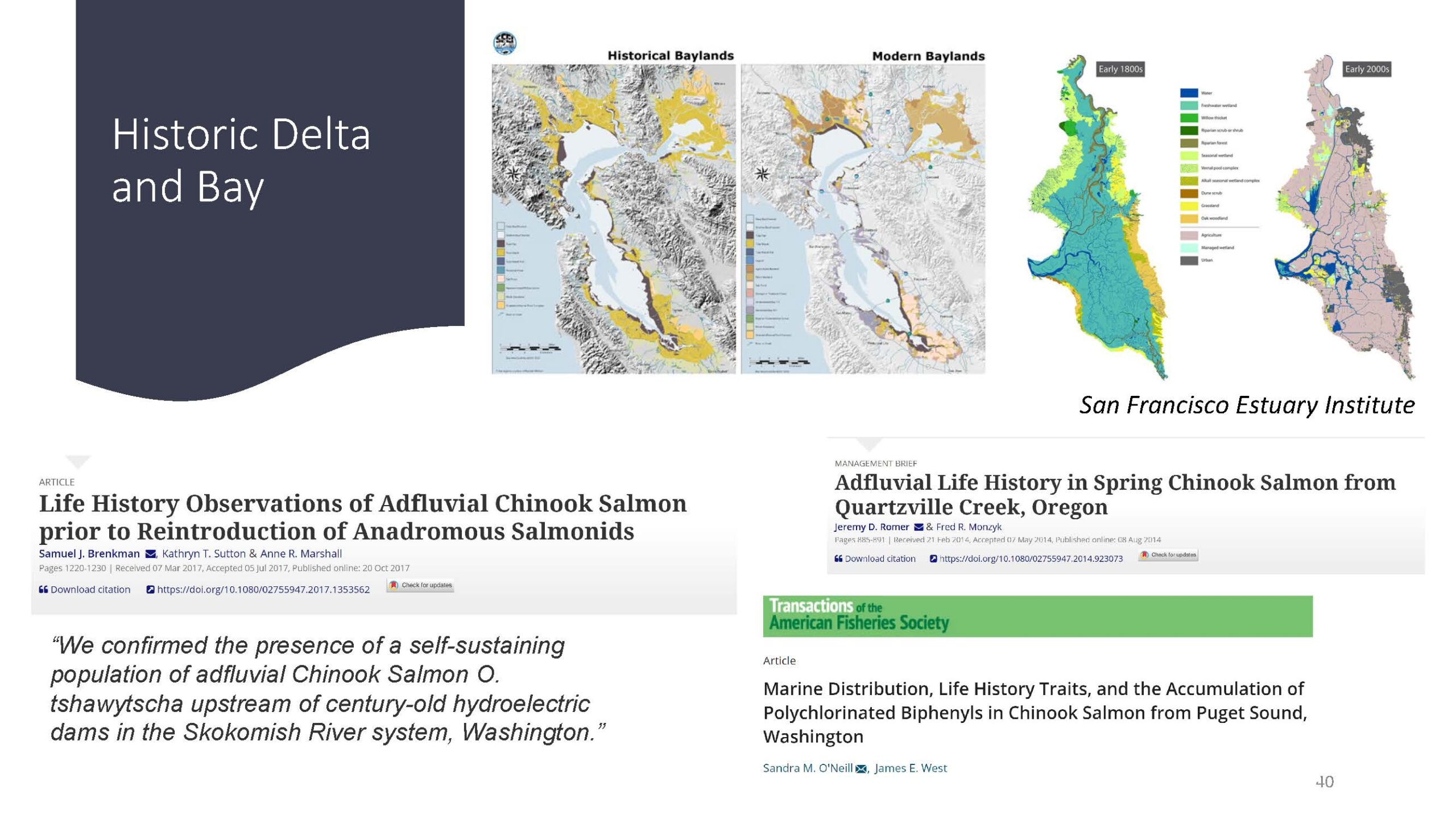 “The historic Delta and Bay used to provide lots of rearing opportunities for salmonids, especially in wet years, such as the early and mid-1800s, and high freshwater outflows and widespread flooding may have increased available habitat even further,” he said. “We also know that chinook trapped above dams, for example, in Washington and Oregon can use adfluvial life history strategies. They are highly adaptable. And we also know that chinook in Puget Sound can remain in brackish water habitats for extended periods of time before migrating out to the ocean.”
