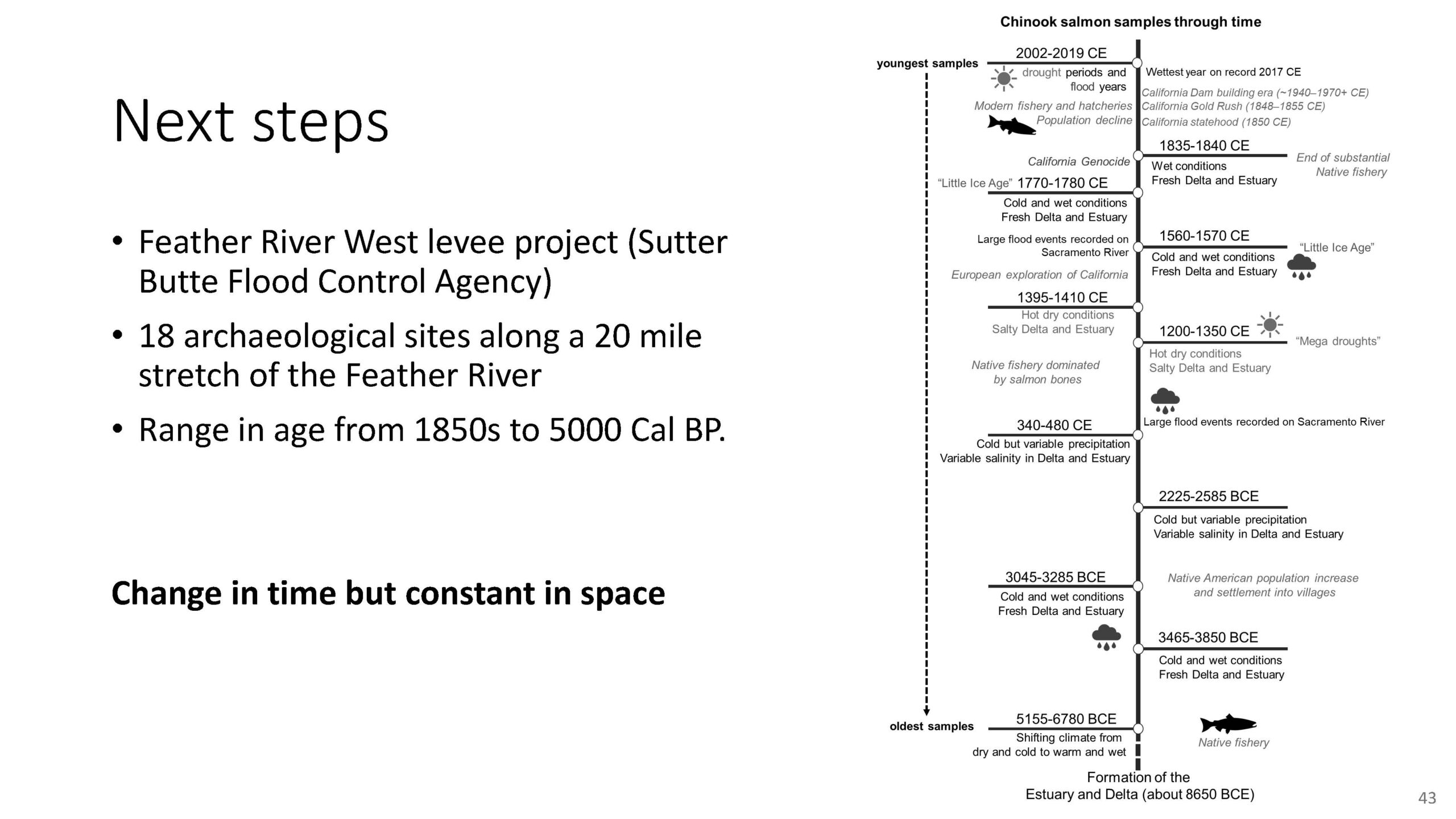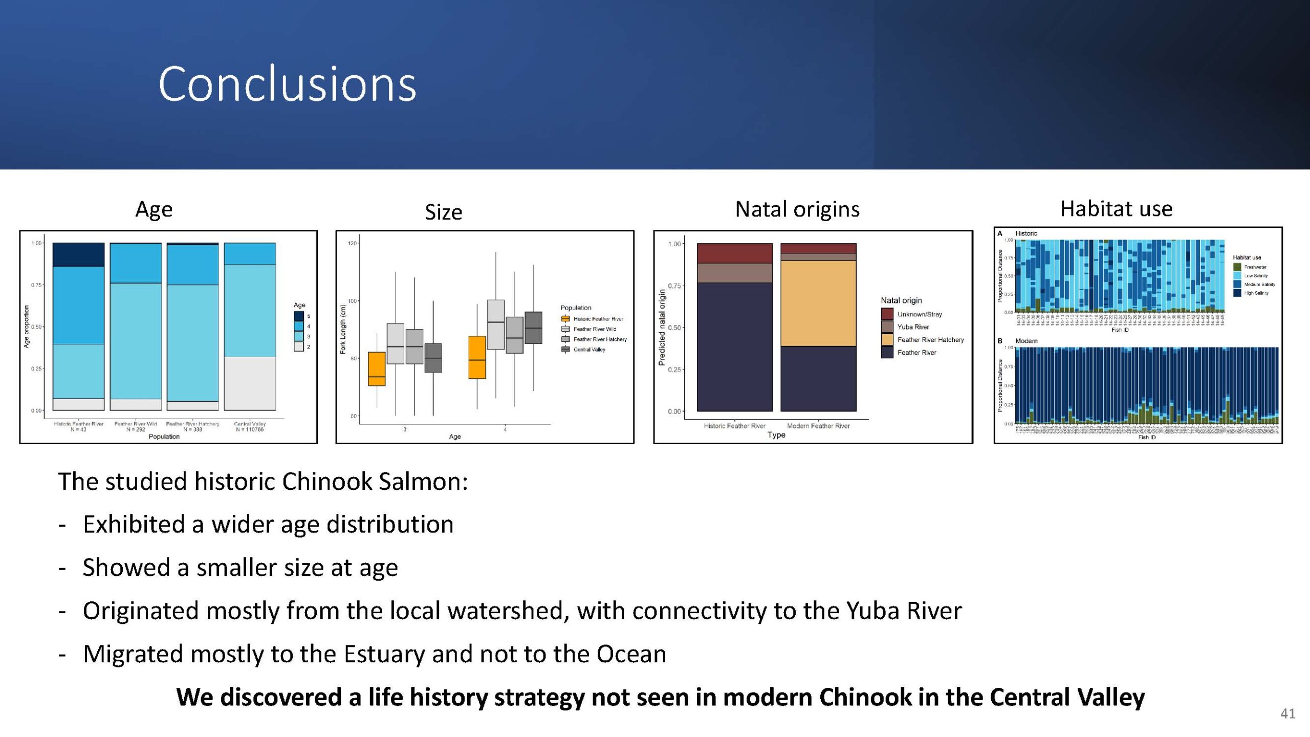 So in conclusion, the study found that historic Chinook salmon exhibited wide age distribution and were smaller sizes at age. They mainly originated from the local watershed of the Feather River with some connectivity from the Yuba river as well, and they mainly migrated through the estuary and not out to the ocean.