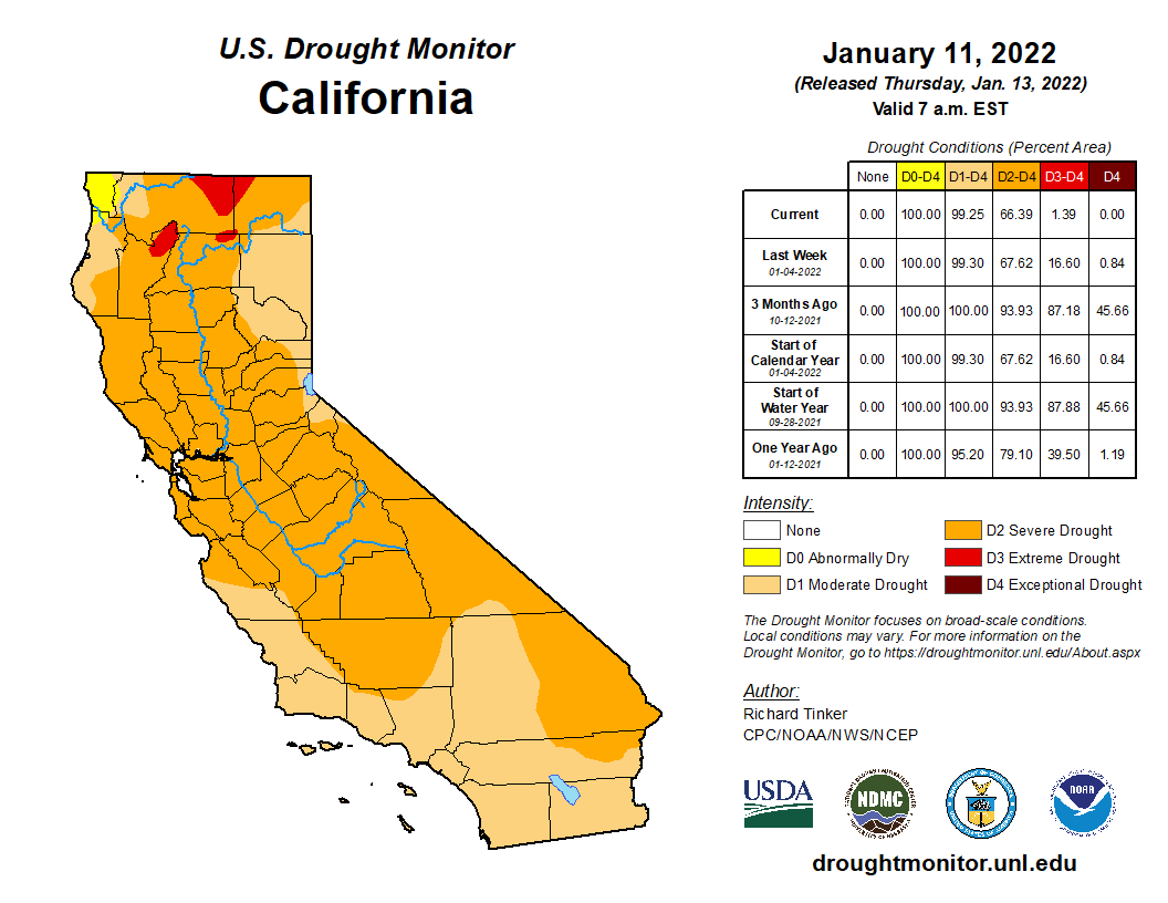 - MEETING: The State Water Resources Control Board will meet beginning at 9am. Agenda items include a Drought Update and Current Hydrologic Conditions, Update from the DWR and Reclamation on their December 1, 2021 TUCP to Modify Delta Flow and Water Quality Requirements from February through April 2022, Consideration of proposed Order prepared by the Administrative Hearings Office on the petition filed by Merced Irrigation District for reconsideration of State Water Board Order WR 2021-0094; Consideration of the proposed Order on the petition filed by the City of Bakersfield for reconsideration of the hearing officer’s legal ruling letter dated November 3, 2021, in the matter of the Kern River Applications; Consideration of a proposed Resolution amending the Guidelines for the California Water and Wastewater Arrearage Payment Program; and Consideration of a proposed Resolution to adopt the Clean Water Act Section 303(d) List of Impaired Waters Portion of the 2020-2022 California Integrated Report. Click here for the complete agenda and remote access instructions.