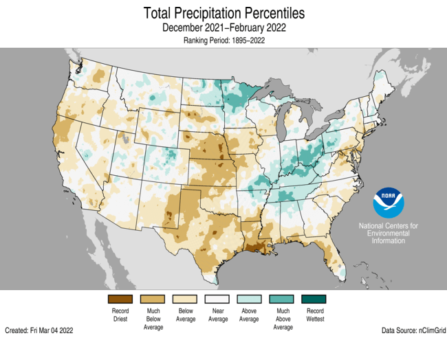 “February continued 2022’s relatively dry start, with the majority of the contiguous U.S. in drought. The end of the month also ushered in the end of meteorological winter, which ranked as the nation’s 12th-driest winter in 128 years. Here are more highlights from NOAA’s latest monthly U.S. climate report ... ” Read more from NOAA here: February capped off a warm, dry winter for U.S.