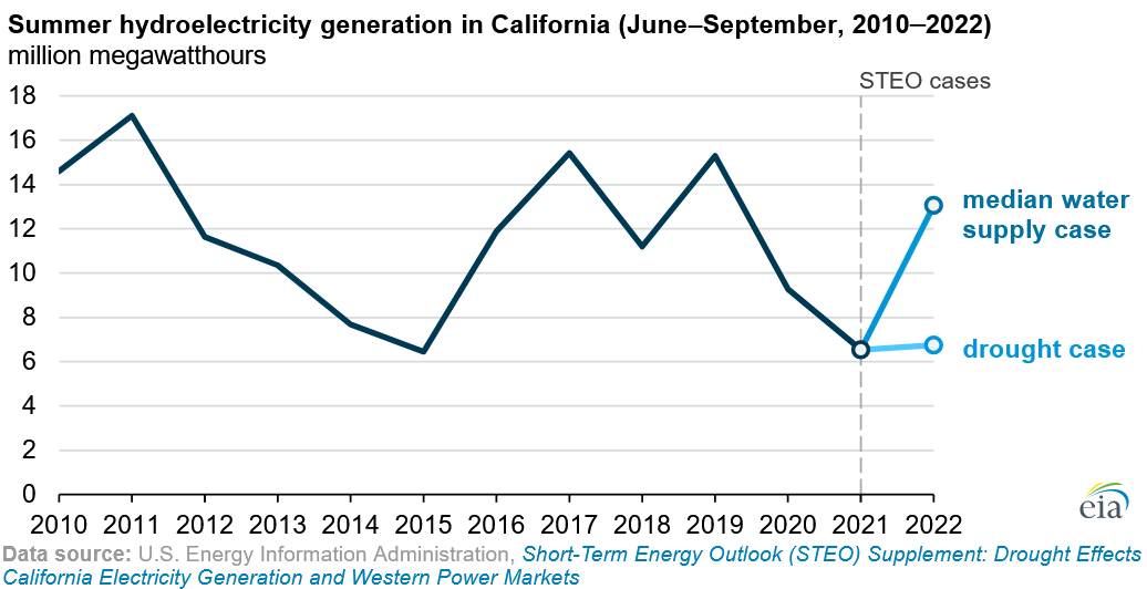 “As part of a supplement to our Short-Term Energy Outlook, we analyzed how drought conditions could affect hydroelectric generation in California this summer. California hydroelectric generation would be 48% less this summer in an alternative case that assumes drought conditions compared with a case that assumes relatively normal water conditions. This shortfall would need to be made up from other sources of electric power supply. During the 2022 water year, which began October 1, 2021, snowpack reached above-normal levels in December, but dry conditions then persisted through March. As of April 1, which typically marks the peak of snowpack, California’s snowpack had an equivalent water content of 6.9 inches, which is about 40% below the median value from 1991 through 2020. Less snowpack means that, as temperatures warm in the spring, less snow will melt and flow into California’s reservoirs. … ” Continue reading at the US Energy Information Administration here: California drought could reduce hydroelectric generation to half of normal levels