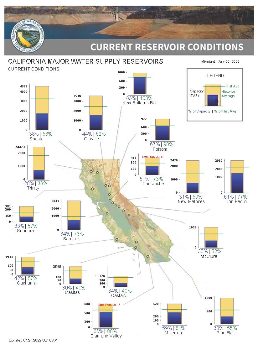 “As drought conditions persist and with the potential for another dry winter due to La Niña, some good news: the California State Water Resources Board learned Wednesday reservoirs in the northern and central parts of the state have more water than at this time last year. State Water Project reservoirs across Northern and Central California remain below historical averages after three consecutive years of drought. But with a combination of people cutting water use, curtailments, farmers fallowing fields and a focus on storage, the reservoirs in the State Water Project are either above or near where they were last year. By the end of September the reservoirs are forecast to be below historical averages but higher than 2021. ... ” Read more from the Courthouse News Service here: Despite more stored water than in 2021, California will keep closing spigots