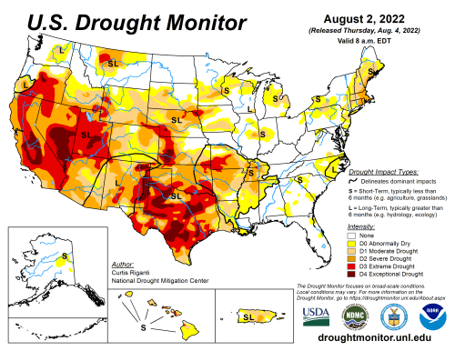 “More than 50% of the country was in some level of drought for the fourth week in a row, the US Drought Monitor reported Thursday, as the combination of extreme heat and low rainfall is drawing the moisture out of plants and soil. And no region of the country has been spared. The West and California remains engulfed in a multi-year megadrought. But even in the Northeast, a severe “flash drought” — one that comes on rapidly — has intensified and expanded from Connecticut, Rhode Island and Massachusetts into New Hampshire and Maine. … ” Read more from CNN here: Half the country is in drought, and no region has been spared