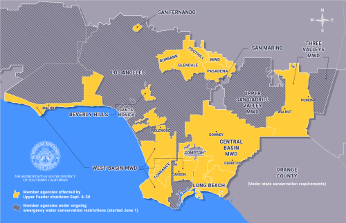 “Starting Tuesday, Sept. 6, residents and businesses in portions of greater Los Angeles County are being called on to suspend outdoor watering for 15 days as a critical imported water pipeline is shut down for emergency repairs. The Metropolitan Water District is joined by its member agencies and local retail water agencies in the water-saving call to stretch Southern California’s severely limited water supplies as Metropolitan repairs this pipeline. The 36-mile Upper Feeder pipeline is an important part of Metropolitan’s regional water system, delivering Colorado River water into Southern California. After a leak was discovered in the pipeline earlier this year, Metropolitan made a temporary repair and began operating the pipeline at a reduced capacity while a more permanent solution was designed and developed. The repair is being made Sept. 6-20, during which the pipeline will be shut down. … ” Read more from Metropolitan here: Portions of LA County called to eliminate outdoor watering for 15 days while important water delivery pipeline repaired