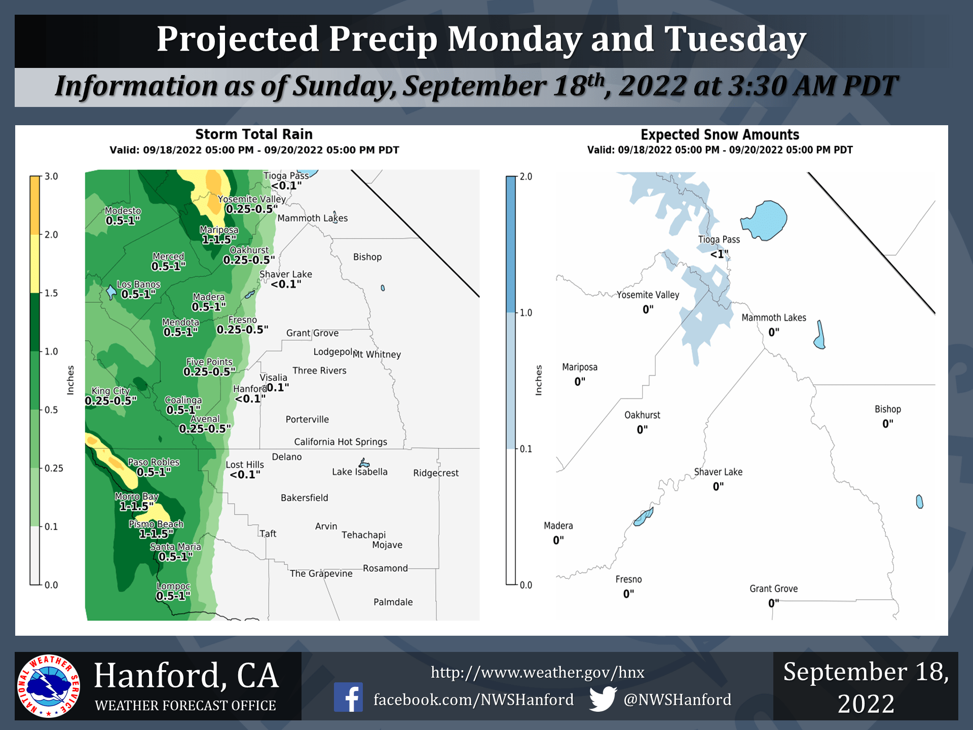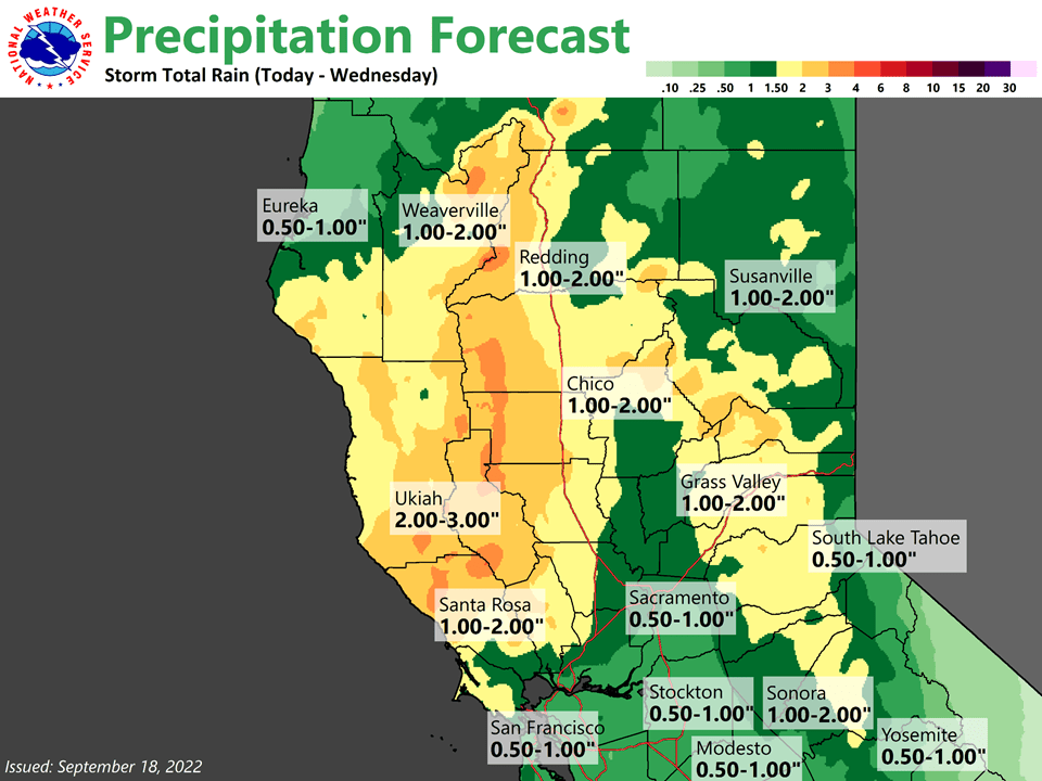 “Early season rainfall and cooler temperatures are expected this weekend in the drought-stricken Northern San Joaquin Valley. The storm is hardly a drought-buster and it won’t signal an end to the wildfire season. But the change in weather is unusual for Modesto, which normally gets less than a quarter inch of rain in September. A strong storm hitting Alaska will affect Northern and Central California and could bring rain totals of 1 inch to 1.25 inches to Modesto over a four-day period, a forecaster said. … ” Read more from the Modesto Bee here: Unusual storm will bring rain, cooler days to Stanislaus region. How much rainfall?