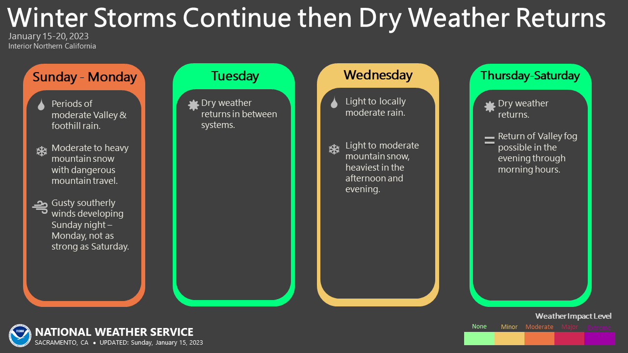“As extreme weather passes throughout the state, Tulare County declares a state of emergency to note the seriousness of the matter. Only two weeks into the new year, the Central Valley already has seen about 30-50% of its annual average rainfall, according to meteorologist Brian Ochs with the National Weather Service (NWS). As of Jan. 13, the NWS has recorded 3.98 inches of rain at their co-op in Visalia, which is well over the monthly average of .91 inches. With that amount of rain, heavy winds, tornado warnings, evacuation notices and damages, the county declared a state of emergency on Tuesday Jan. 10. The day before, Kaweah River reported the most water intake in the past 16 years. … ” Read more from the Foothills Sun-Gazette here: Rain plunges Tulare County into state of emergency