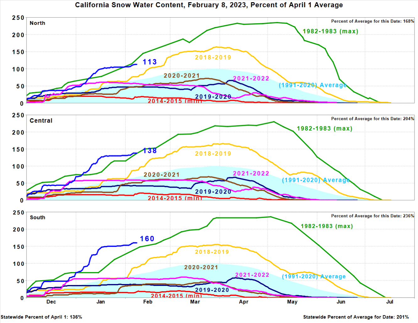 “A wetter winter with ample snowpack is a hopeful sign for some drought relief in the West, including California, but it won’t make a significant difference for the Colorado River Valley’s 20-plus-year long drought. Let’s explore each of the factors water managers in the West are watching closely, beginning with the hopeful signs. As of Feb. 6, the water content of the snowpack was at least 50 percent above average from Utah and northern Arizona to Nevada and most of California’s Sierra, according to data from the National Resources Conservation Service’s SNOTEL network. In some of these areas, the snowpack was at record early-February levels, in records dating as far back as the late 1970s. … ” Read more from The Weather Channel here: California, western drought status: Snowpack, reservoir levels improved, but more needed