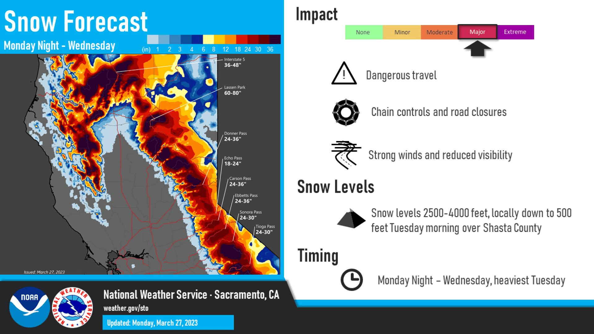 “As many families prepare to travel to California’s Sierra Nevada for spring break, the National Weather Service is sounding the alarm bells and warning of dangerous travel conditions: A storm is expected to unleash a torrent of snow Monday night into Wednesday. If you want to drive to the Tahoe Basin, Monday morning and afternoon offer the best opportunity before the snow starts falling. “If you do go up today, plan to stay up there for a few days,” Scott Rowe, a forecaster with the weather service, said. “Travel will become very difficult after tonight. It’s very possible there could be travel delays and road closures. The potential for heavy snow rates is a real possibility.” … ” Read more from SF Gate.
