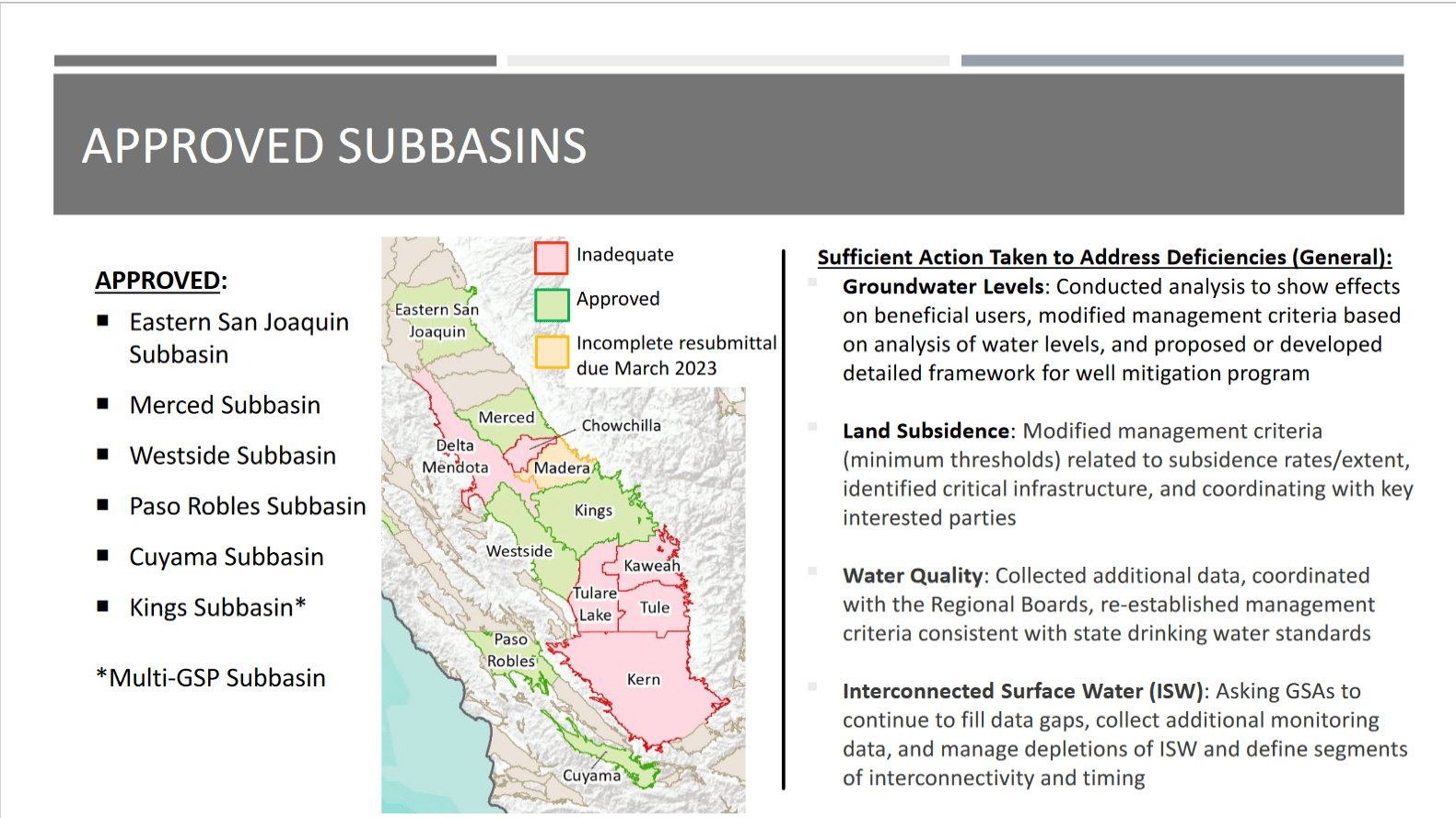 For those plans considered incomplete, the GSAs had 180 days to correct the deficiencies and resubmit the plans. Six of the twelve resubmitted plans were approved: Eastern San Joaquin, Merced, Westside, Paso Robles, Cuyama, and Kings Basin. The Kings Basin was the only multi-GSP basin plan that was approved.