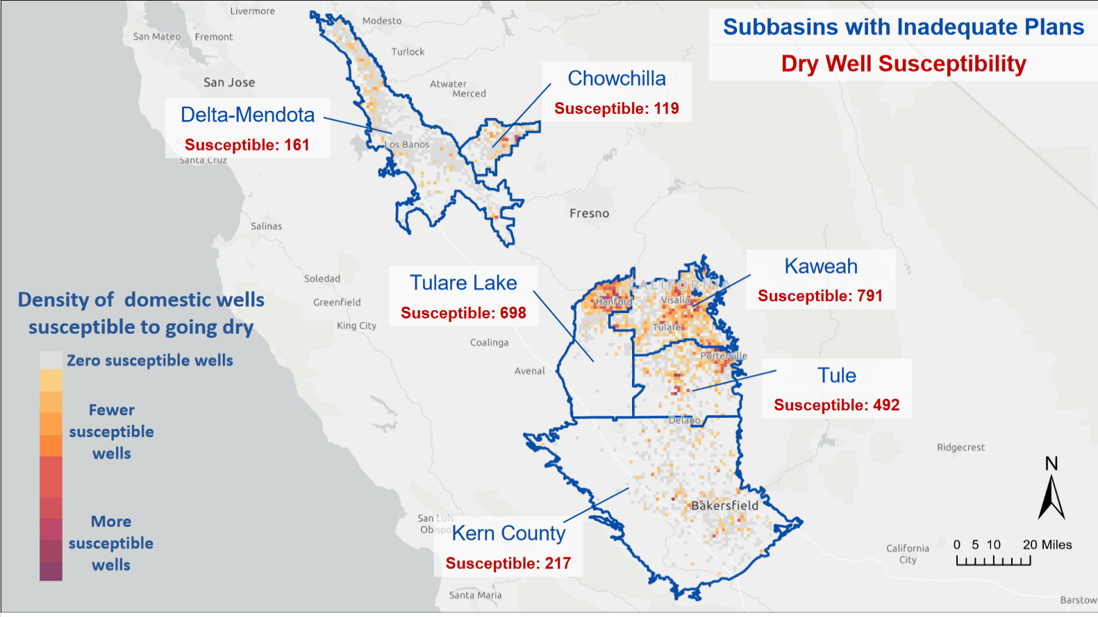 The six basins are shown on the map below. The data is from a dry well susceptibility analysis that DWR conducted in coordination with the Water Board, which uses current groundwater elevations and projects modeled future groundwater levels to locate where domestic wells could run dry if groundwater levels continue to decline.