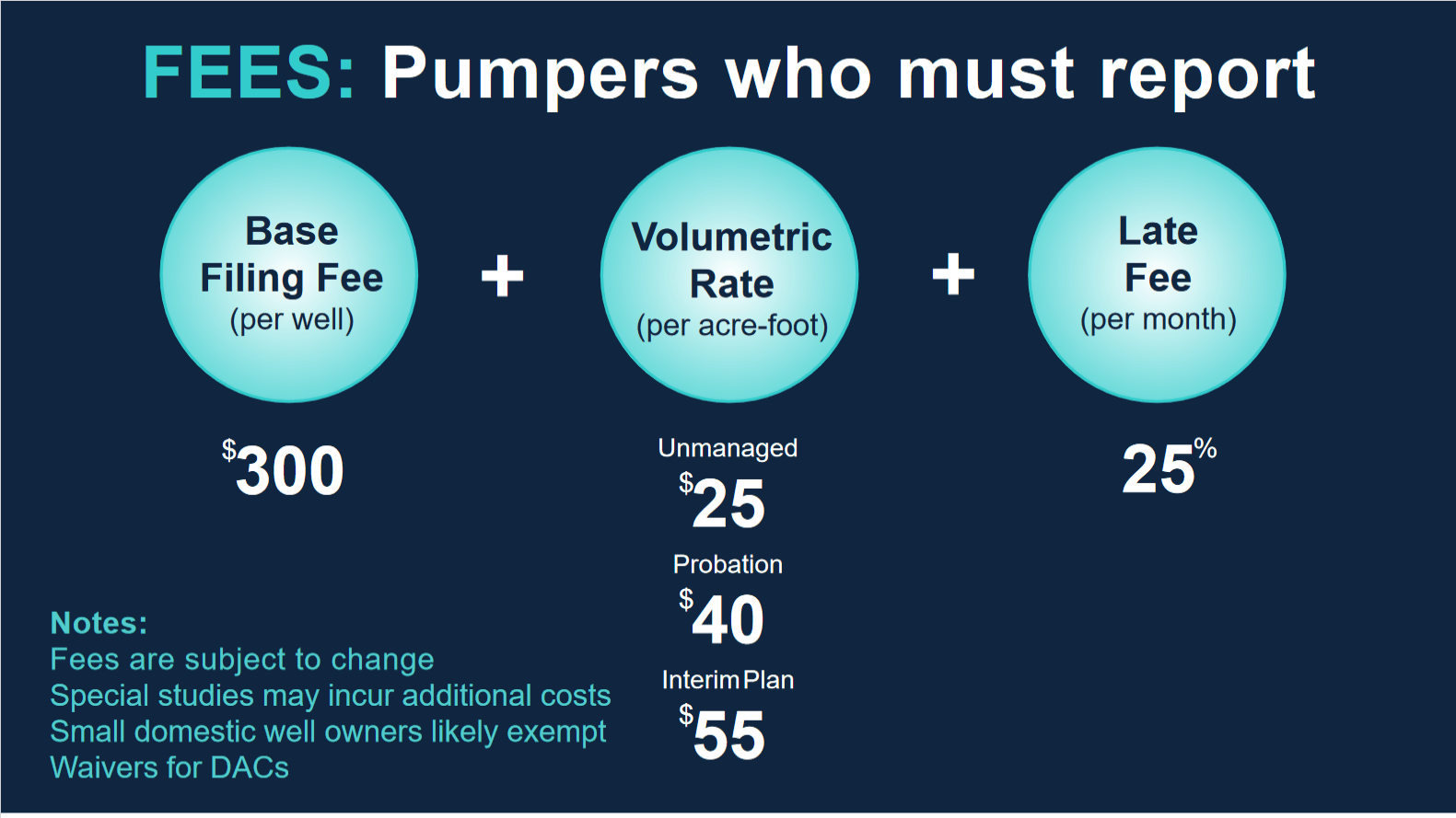 The statute requires the Board to recover the costs of state intervention; these costs are recouped through fees tied to each groundwater extraction report. The fees, adopted by emergency regulation in 2017, are comprised of a $300 base filing fee, a volumetric rate dependent on the level of state intervention, and an automatic late fee for those who don’t file on time. The fees are subject to change if needed to fully recoup the program costs. The Board can also direct the GSA to conduct special studies, which would result in additional costs beyond these fees.