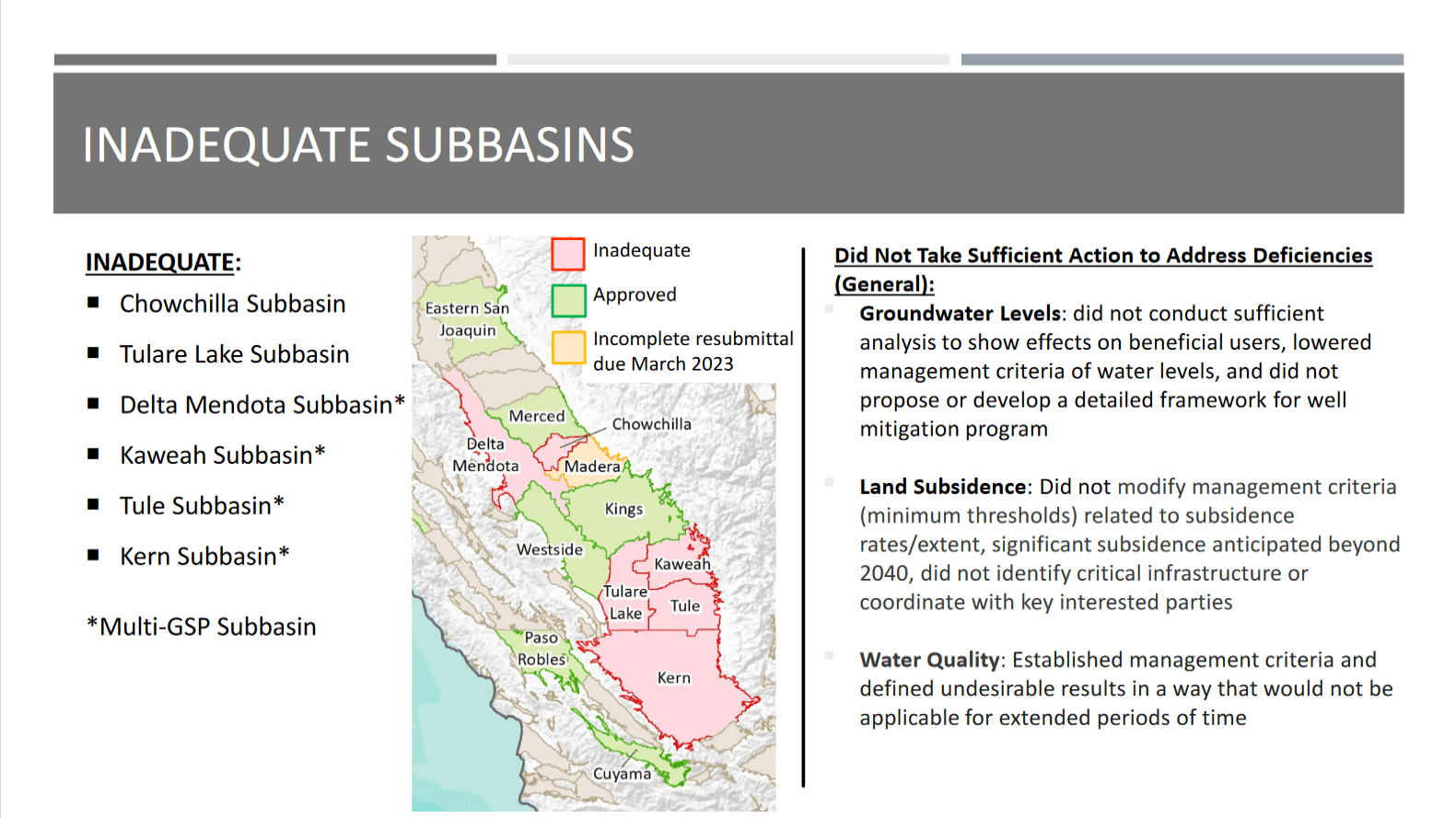 After consultation with the State Water Board, six basin plans were deemed inadequate: Chowchilla Subbasin, Tulare Lake Subbasin, Delta Mendota Subbasin, Kaweah Subbasin, Tule Subbasin, and Kern Subbasin. The inadequacies included groundwater level impacts; not fully disclosing and evaluating all impacts to groundwater users, uses, and wells; land subsidence near critical infrastructure without explaining how that will not be significant and unreasonable; and not characterizing and fully disclosing all the constituents of concern.