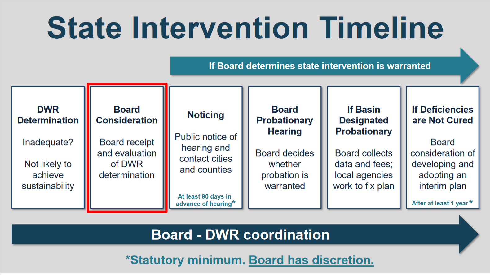 Now that six plans have been determined to be inadequate, the next step is for the Board to consider taking action. SGMA sets minimum timelines; the Board can choose to move slower or not to take any action.