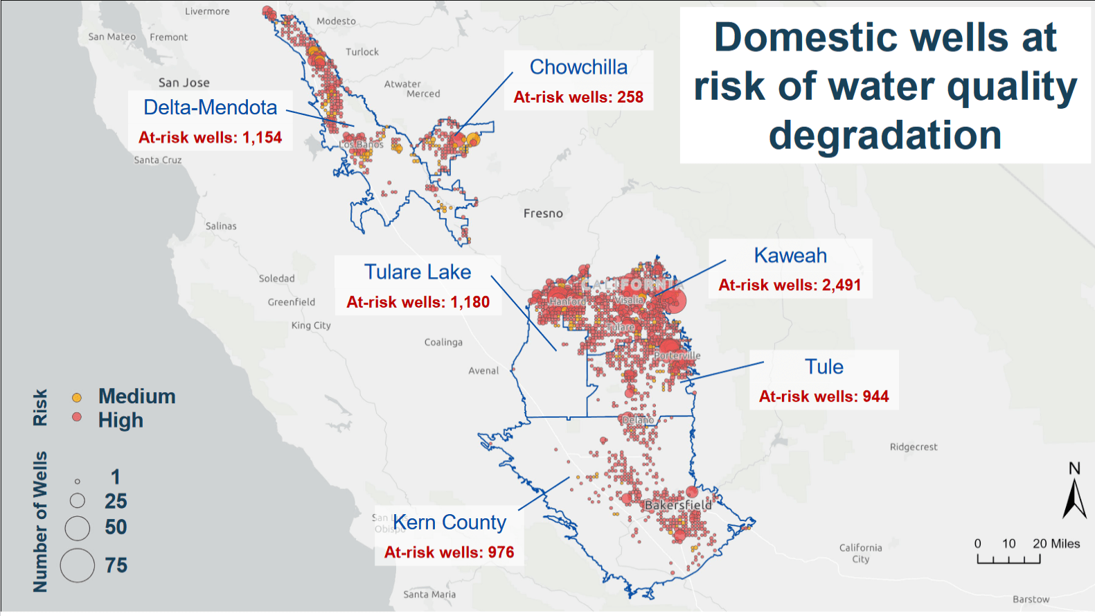 The figure on the slide below uses data from the Board’s Groundwater Ambient Monitoring and Assessment (GAMA) program overlaid with domestic well locations to illustrate the concentration of domestic wells that are at a high or medium risk of experiencing water quality impacts from six constituents that have been or that have the potential to be exacerbated by lowering groundwater levels.