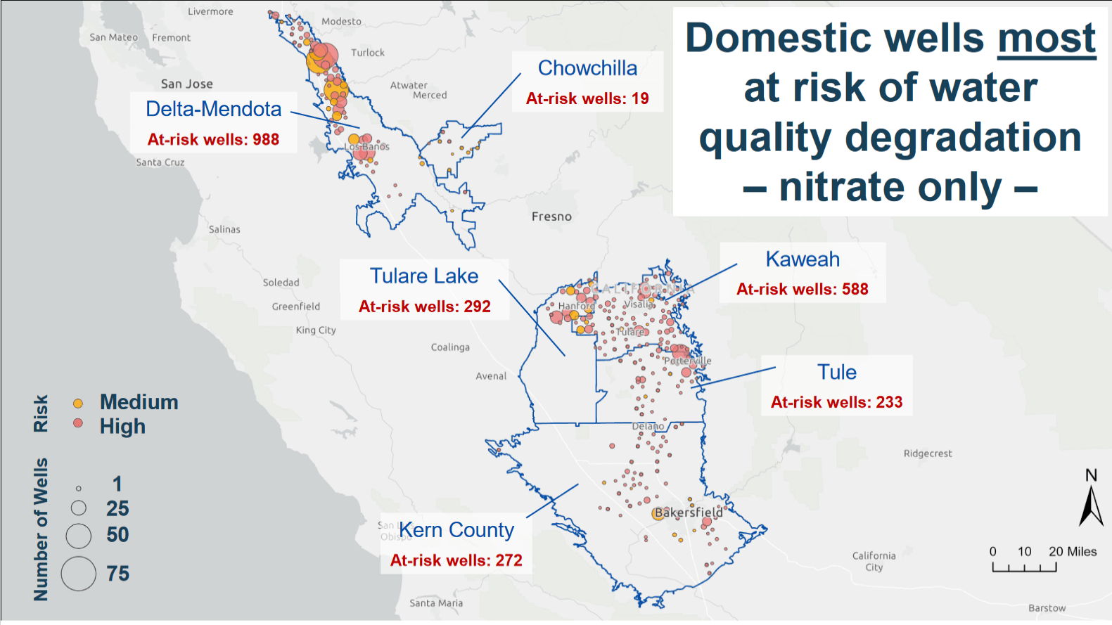 The figure below shows only the data for nitrate, a shallow constituent that can be pulled into wells as groundwater levels decline. Additionally, only groundwater wells with construction information drawing water from above the Corcoran clay are shown. This is because the Corcoran clay spans much of this region, separating the aquifer into an upper and lower, and wells that draw from the upper aquifer are likely to have problems as groundwater levels decline due to the susceptibility of nitrates and other shallow constituents.