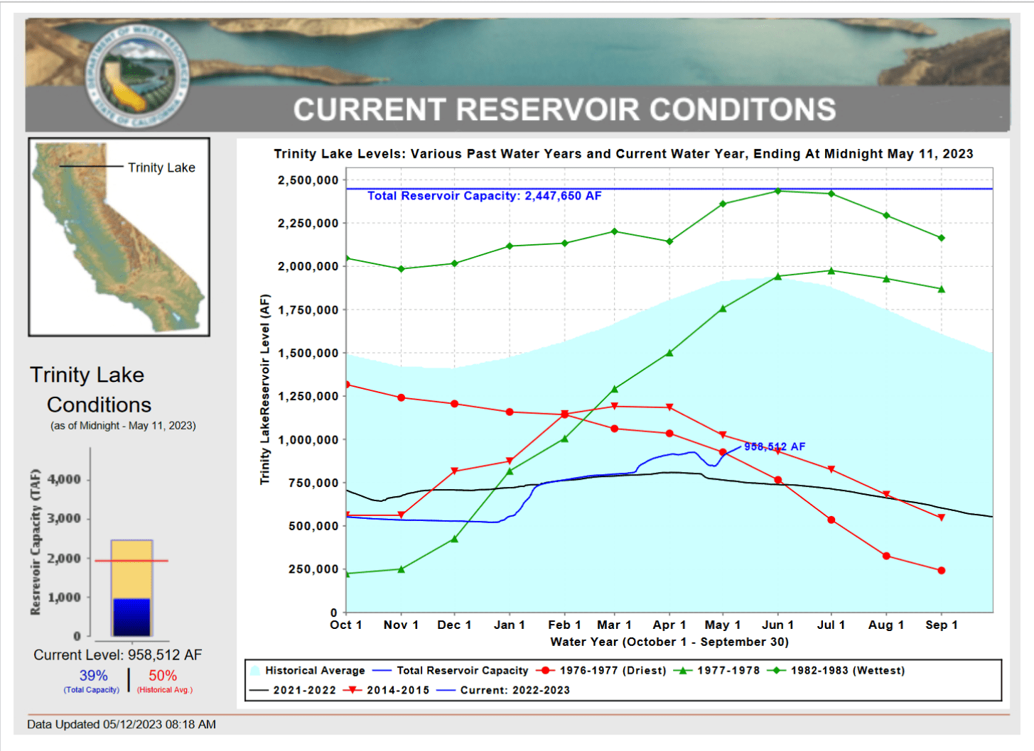 “There has been a lot of attention on the parts of California that saw a huge winter. One example is the Tulare Lake basin, which has flooded again as the southern Sierra snowpack melts. Just about all of the state’s reservoirs are now near full. Shasta and Oroville, the two largest, are both well above their historical averages. Trinity Lake, however, is one Northern California reservoir where all the rain and snow hasn’t quite added up. Trinity is at just 39 percent capacity — just half its historical average. It’s a reservoir that works a bit differently from others but the people living there think they missed out on this winter and they’re not happy about it. “I’ve been up here for 22 years,” said Trinity Alps Marina owner Darryl Marlin. “I’ve seen it go up and down. We’ve had droughts before. This lake should be about three-quarters full right now.” … ” Read more from CBS News.