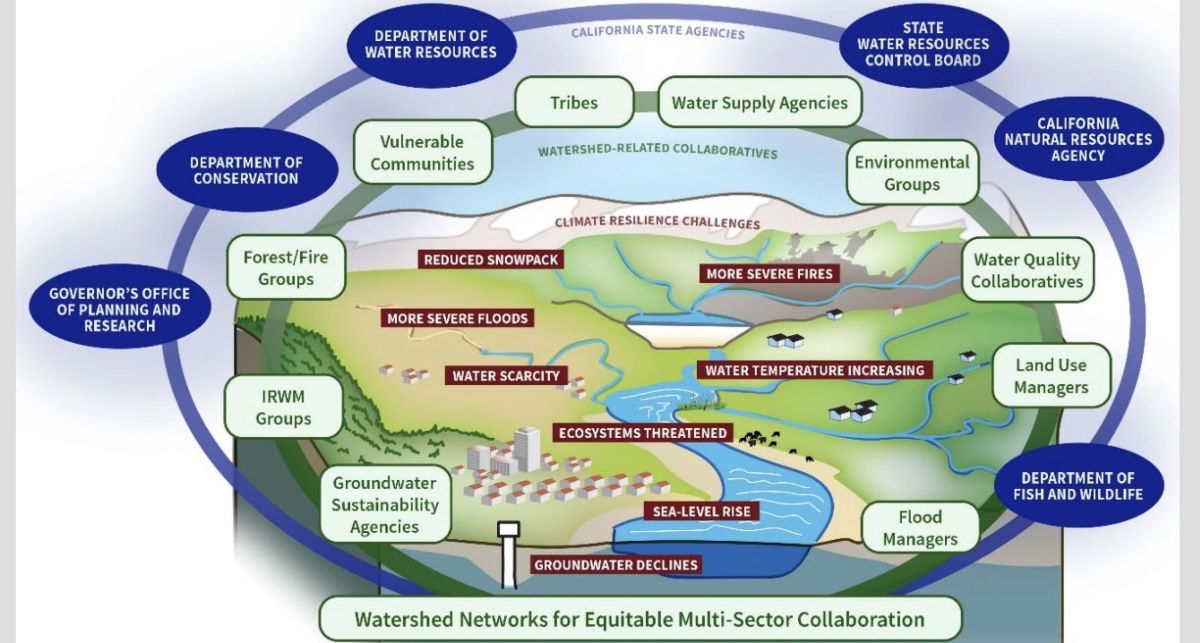 The outer circle shows the many state agencies and departments with responsibility and authority over different aspects of the watershed. “We [the State], too, have to learn to align and be part of these watershed networks if they’re going to be successful,” said Mr. Guivetchi. “Often what we hear in our public meetings is the frustration that it’s very difficult to know who to work with and how to work with the state government to get things done. And often, it takes a lot of time, effort, and cost on the part of locals, so part of this watershed network approach is pointing back to ourselves and saying we [the State] have to be part of that solution.”