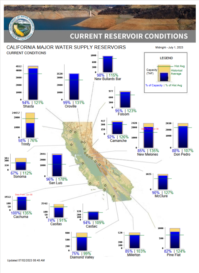 All CVP reservoirs enjoyed a robust hydrologic year with inflow percentages of their 15-year averages for Trinity, Shasta, Folsom, New Melones, and Millerton reservoirs being 145, 119, 180, 221 and 253%, respectively. Shasta Reservoir in fact, will likely exceed 5 million acre-feet (MAF) of accumulated inflow sometime soon after the July 4th weekend.