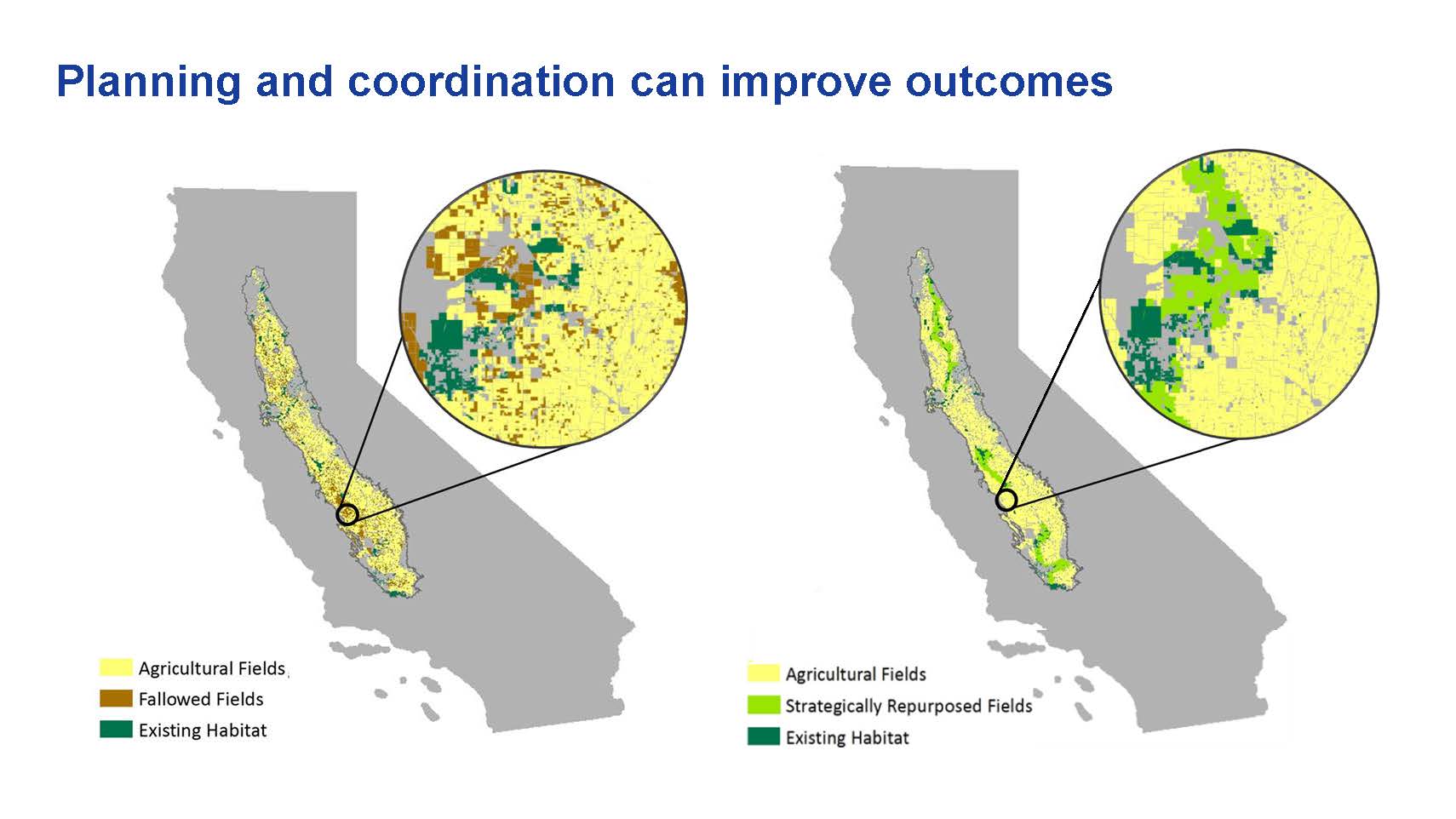 The slide gives a hypothetical example of how habitat restoration might play out on the landscape. The map on the left shows how fallowing might occur under inflexible trading rules; the fallowing is haphazard, creating a patchwork of fallowed fields interspersed among agricultural fields. On the map on the right, under flexible rules, the fallowing is more strategically located, working with farmers who would voluntarily repurpose some of their land that they no longer have water to irrigate and repurpose their land to create habitat adjacent to existing areas of habitat, shown in dark green.