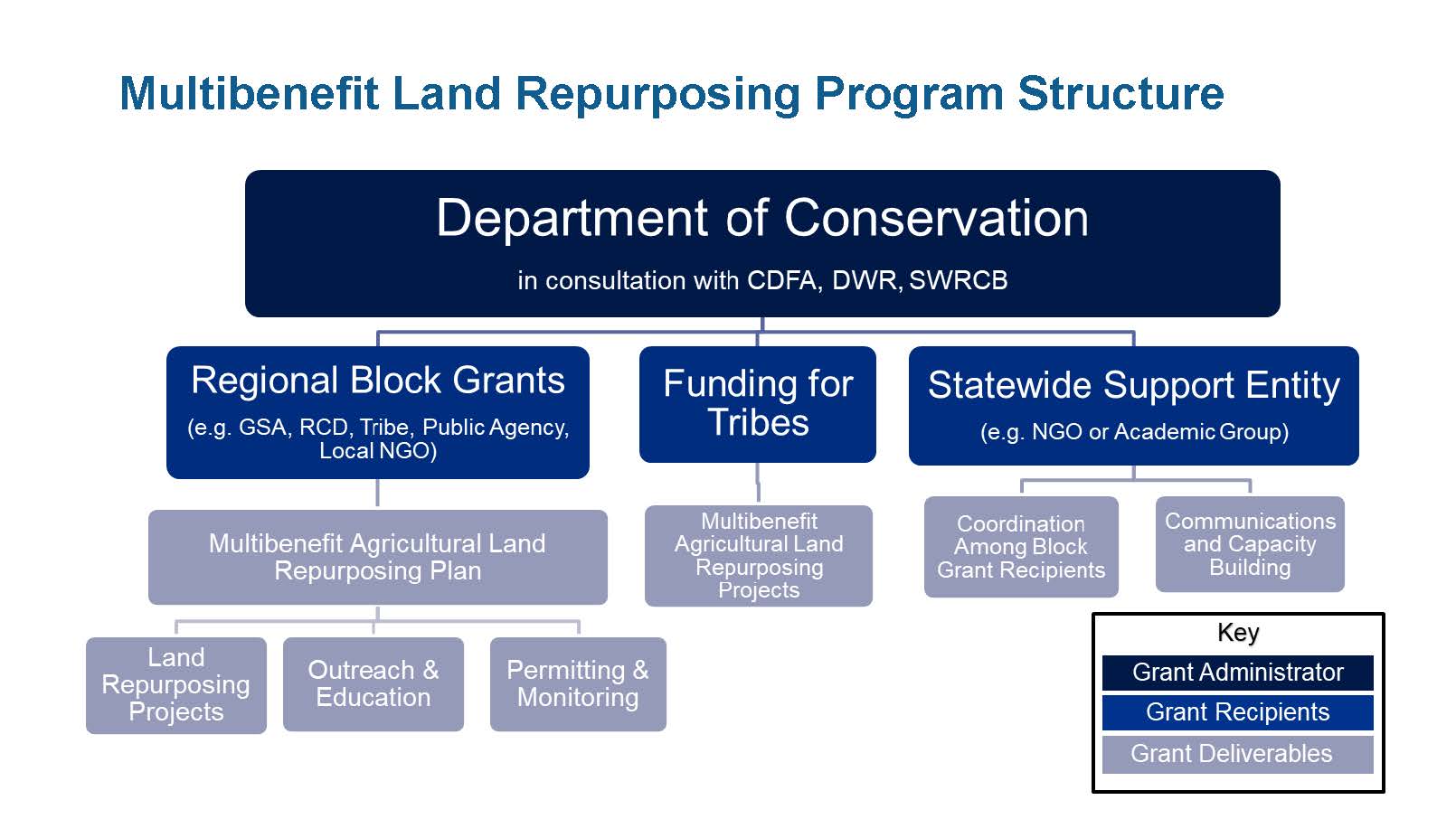 The Multibenefit Land Repurposing Program is housed with the Department of Conservation, which implements it in consultation with other state agencies involved in SGMA implementation, such as the Department of Water Resources, the Department of Food and Ag, and the State Water Board.