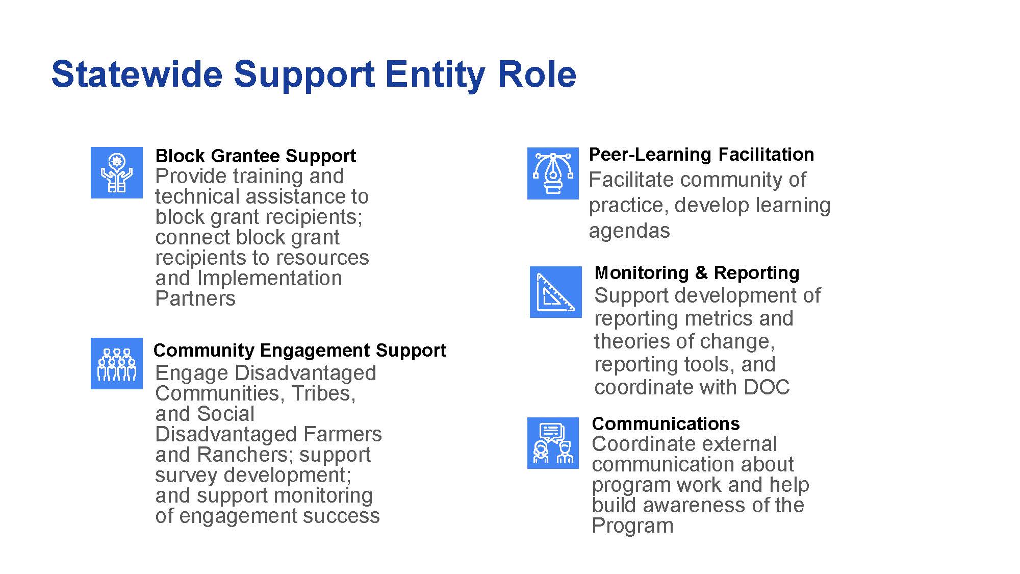 “I see our role as creating a hub of the best available information on a whole suite of land repurposing strategies and to be a direct resource for the block grantees,” said Ms. Hayden. “We are also tasked with helping to shape community engagement for these block grants, ensuring that they’re bringing in voices from disadvantaged communities and socially disadvantaged farming and ranching individuals. We’re also helping to facilitate and a peer to peer learning and to create a community of practice.”