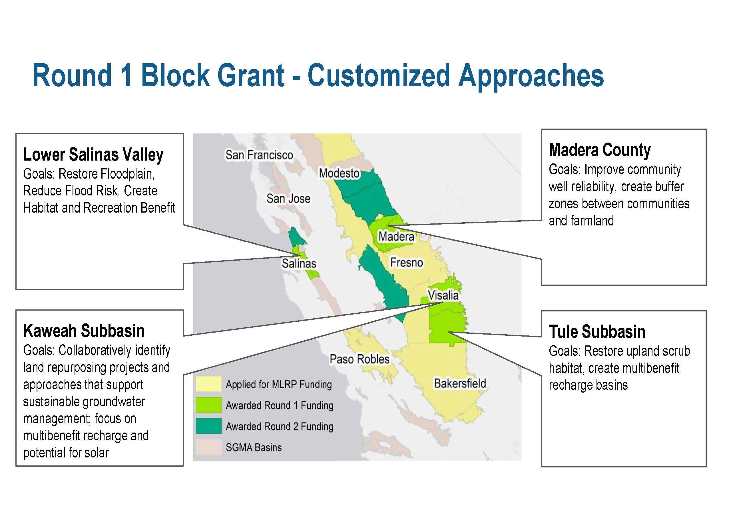 Ms. Hayden noted that this program is not overly prescriptive. “The Department of Conservation really wants to allow for creativity, innovation, and customized approaches, so we’re going to see a variety of plan objectives included, from Madera really focused on improving community well reliability and buffer zones between communities and farmland to the Tule basin really focused on restoring upland scrub habitat and multi-benefit groundwater recharge basins.”