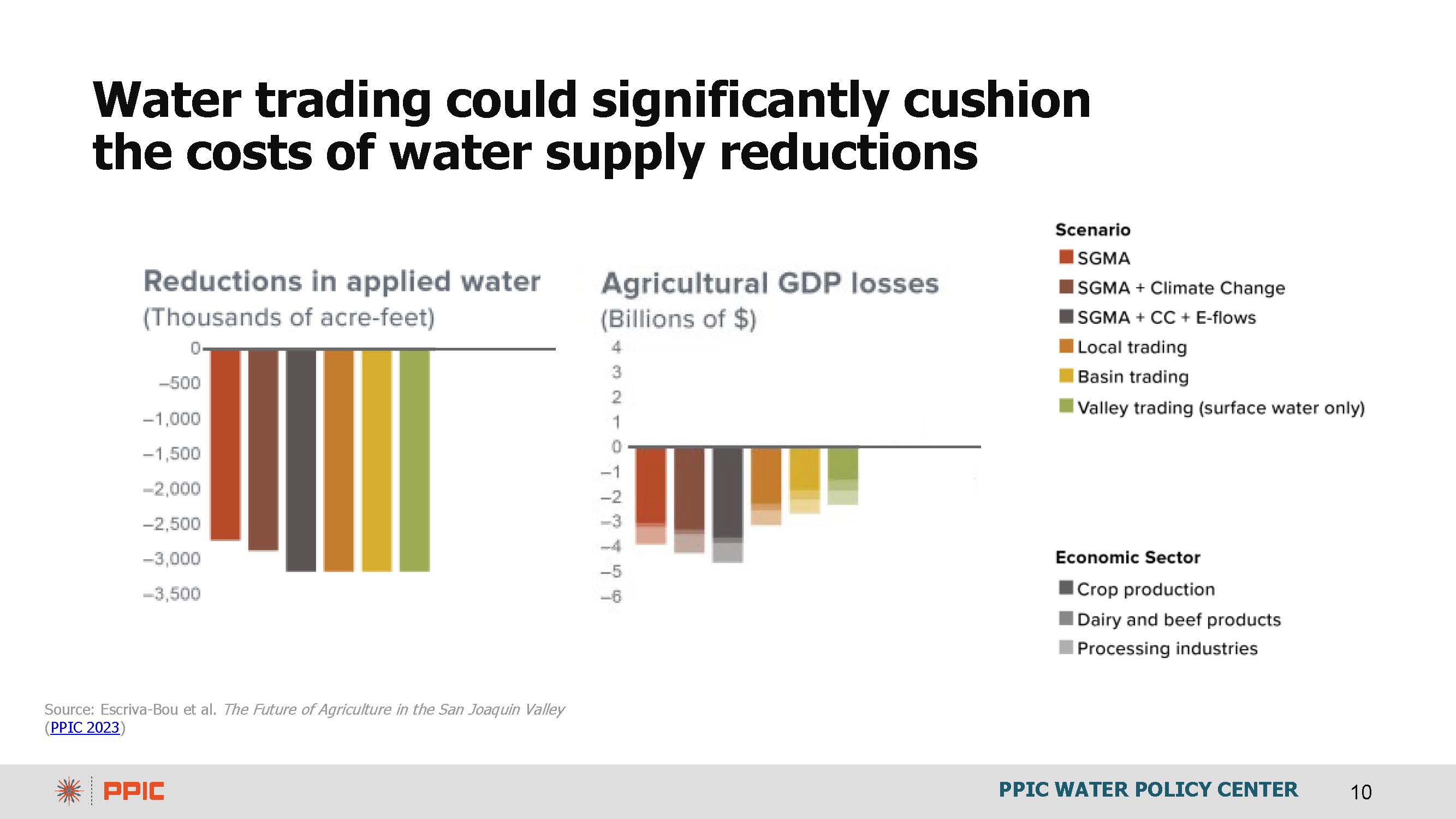 The additional bars on the chart below illustrate how water trading can significantly cushion the costs of reducing water supplies. Ms. Hanak pointed out that the reduction in applied water stays the same – the amount of water is not changing. However, with water trading, water can be moved around so that it goes to the most economically productive crops. Growers with high-value crops would want to buy the water, and growers with less economically productive crops would be willing to sell their water.