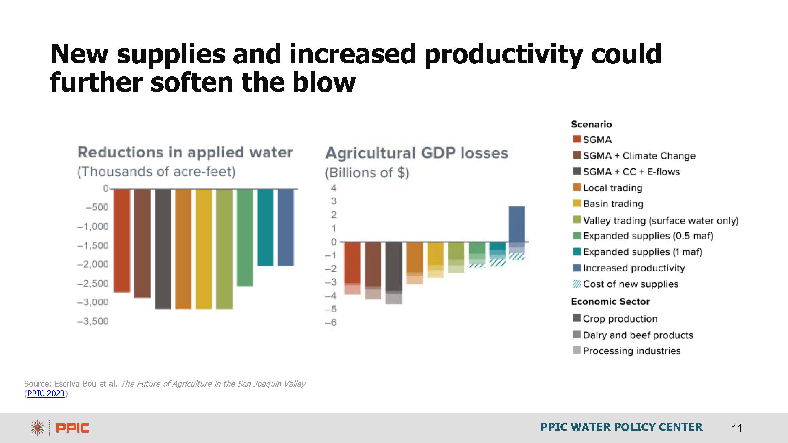 Of course, GSAs would rather augment supplies than reduce groundwater use, but there’s growing recognition that demand management will have to be part of the story. So the PPIC has been studying ways to soften the transition using tools such as improving water trading rules, updating water infrastructure, recharging groundwater, increasing ag productivity, and finding productive uses for fallowed lands.