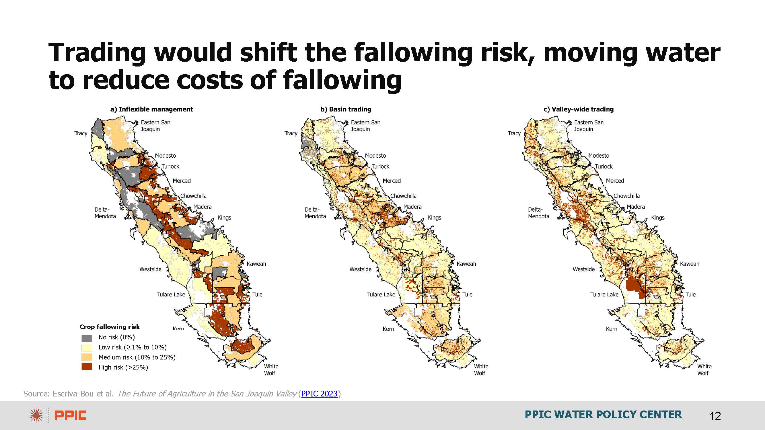 With inflexible trading rules, much land across the San Joaquin Valley is at risk of being fallowed, as shown on the map on the left. With basin trading, shown in the center, there is much less fallowing risk, and it is distributed across the Valley as water moves from alfalfa and field crops to perennials. With Valley-wide trading, depicted on the map on the right, the surface water moves out of some basins where conditions are unsuitable for higher-value crops and moves to other places.