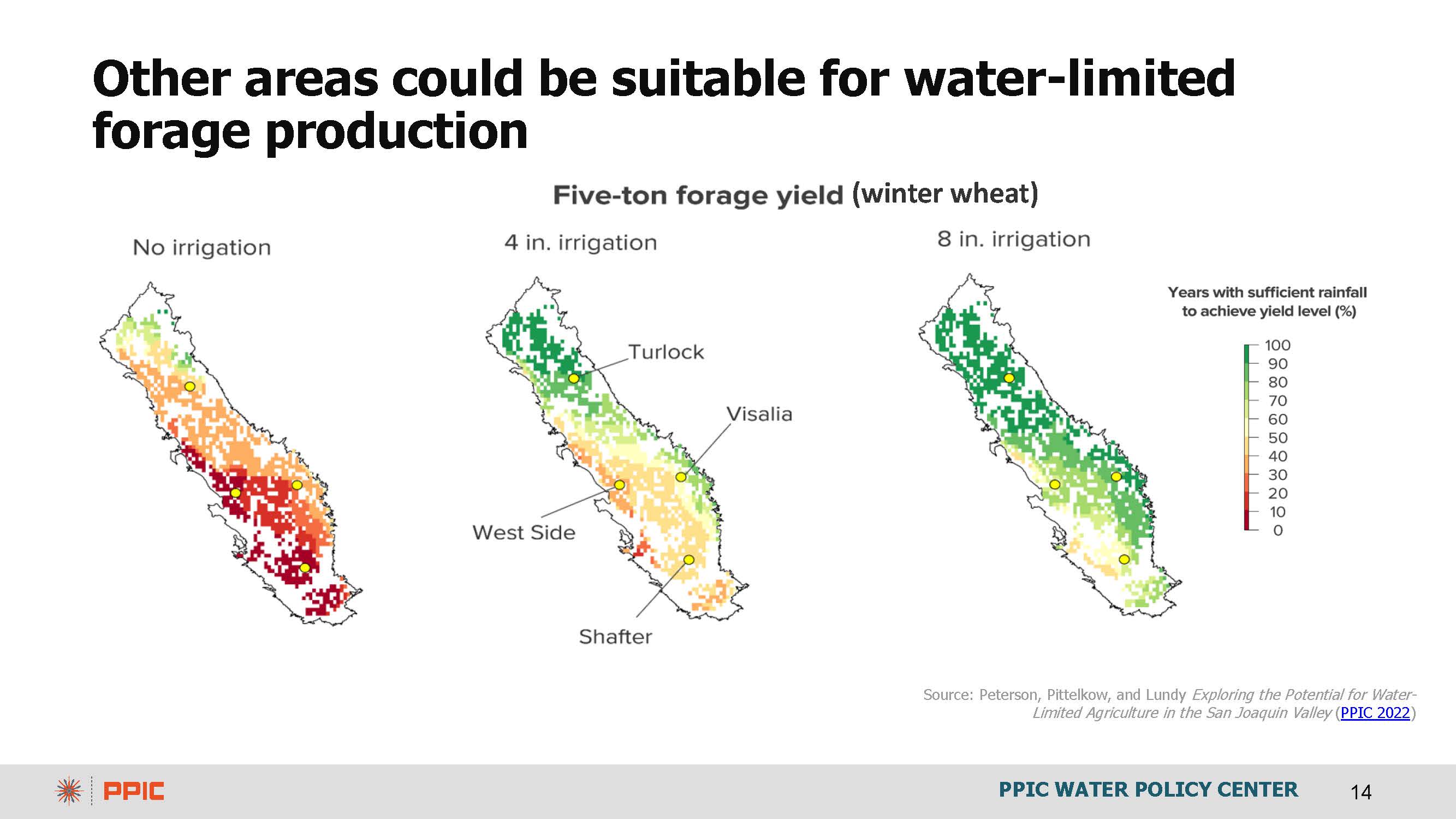 The PPIC also considered dryland farming for winter crops, using no irrigation water on the left and various amounts of irrigation to help with crop establishment as the graphic moves to the right. This work was done using winter wheat as a forage crop because there will likely be demand for increased sources of forage as alfalfa and irrigated pasture are likely to decline.