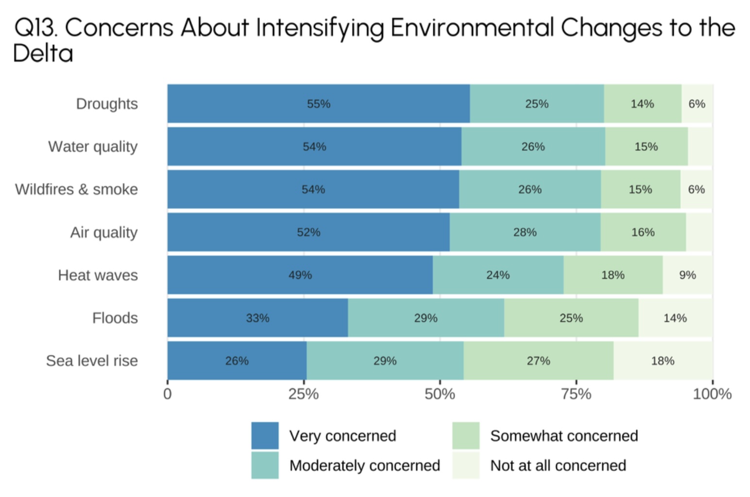 Another surprising nugget is that climate change is a widely-shared concern across the region. Rural and urban residents alike, across demographics and political ideology, report high levels of concern. A lot of people in the Delta are very connected to the land and have seen changes over time, such as increased algal blooms and extreme heat events, and worsening air quality.