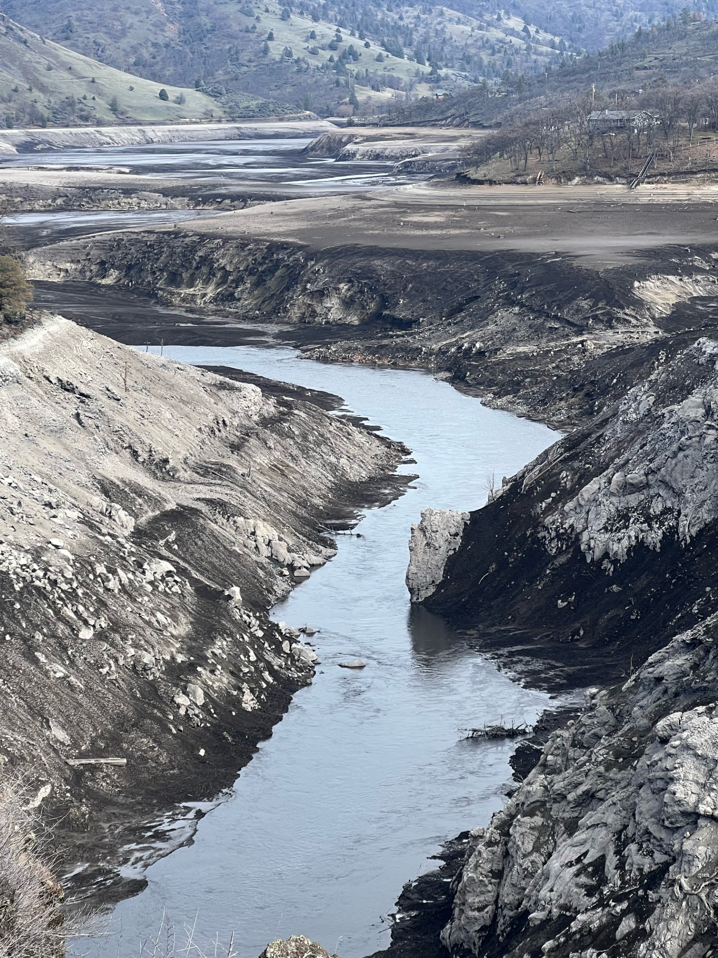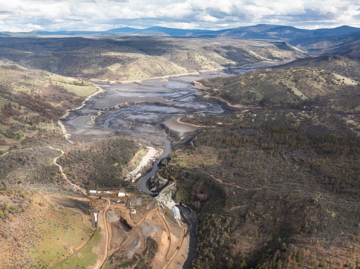 Copco No. 2, a diversion dam that was located just downstream of Copco No. 1, was removed last year. The remaining three dams, Copco No. 1, Iron Gate, and JC Boyle created reservoirs that needed to be drawn down before removal could begin. The initial phase of drawdown concluded last month, and shortly thereafter FERC approved an advancement in the schedule, allowing for the removal of Copco No. 1 ahead of the other remaining dams. Iron Gate and JC Boyle, which are clay core earthen dams, will remain at their full height until the spring runoff period has concluded and the Klamath River has returned to baseline flows. Work on their deconstruction will likely begin sometime in May, depending on precipitation.