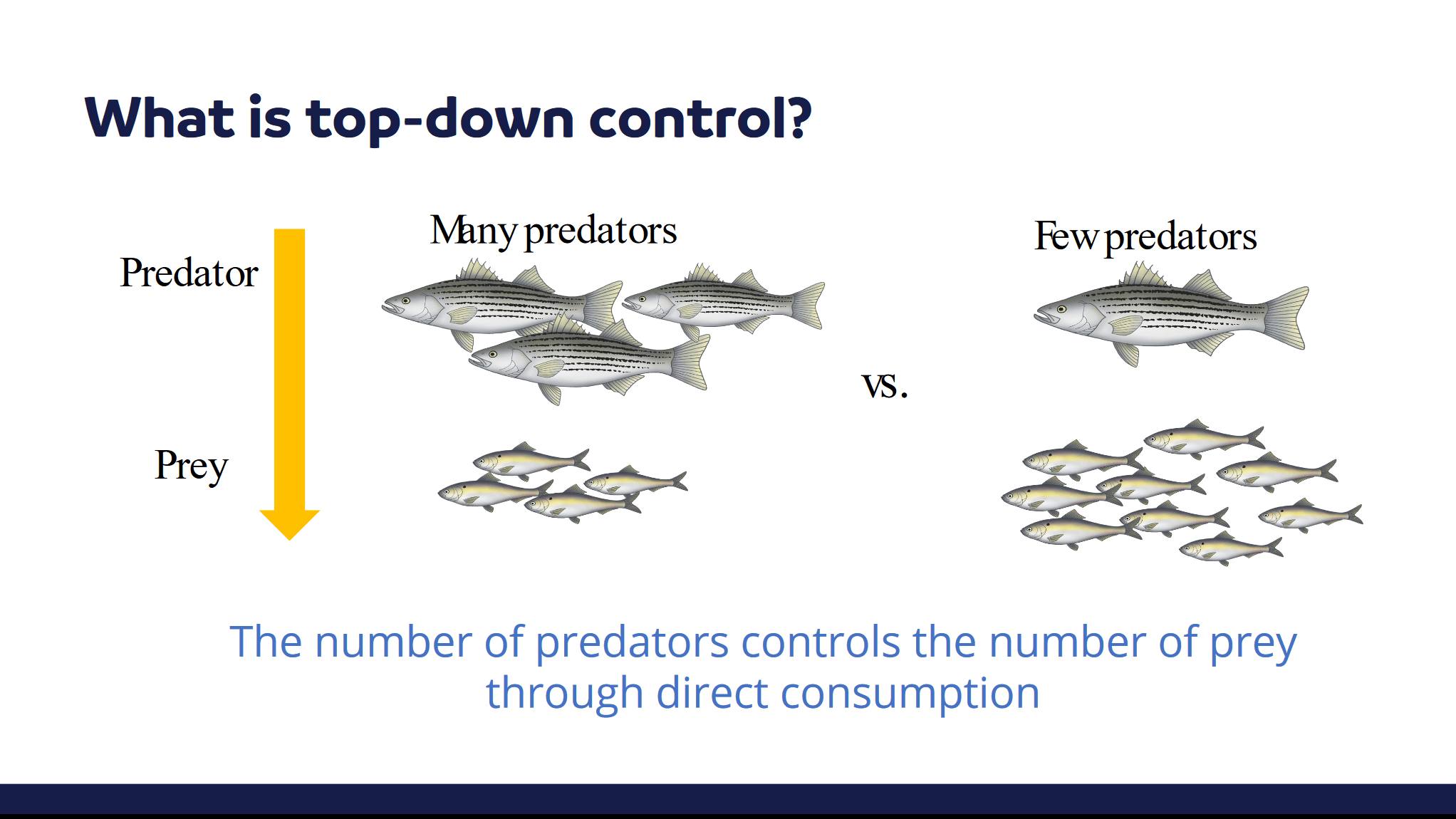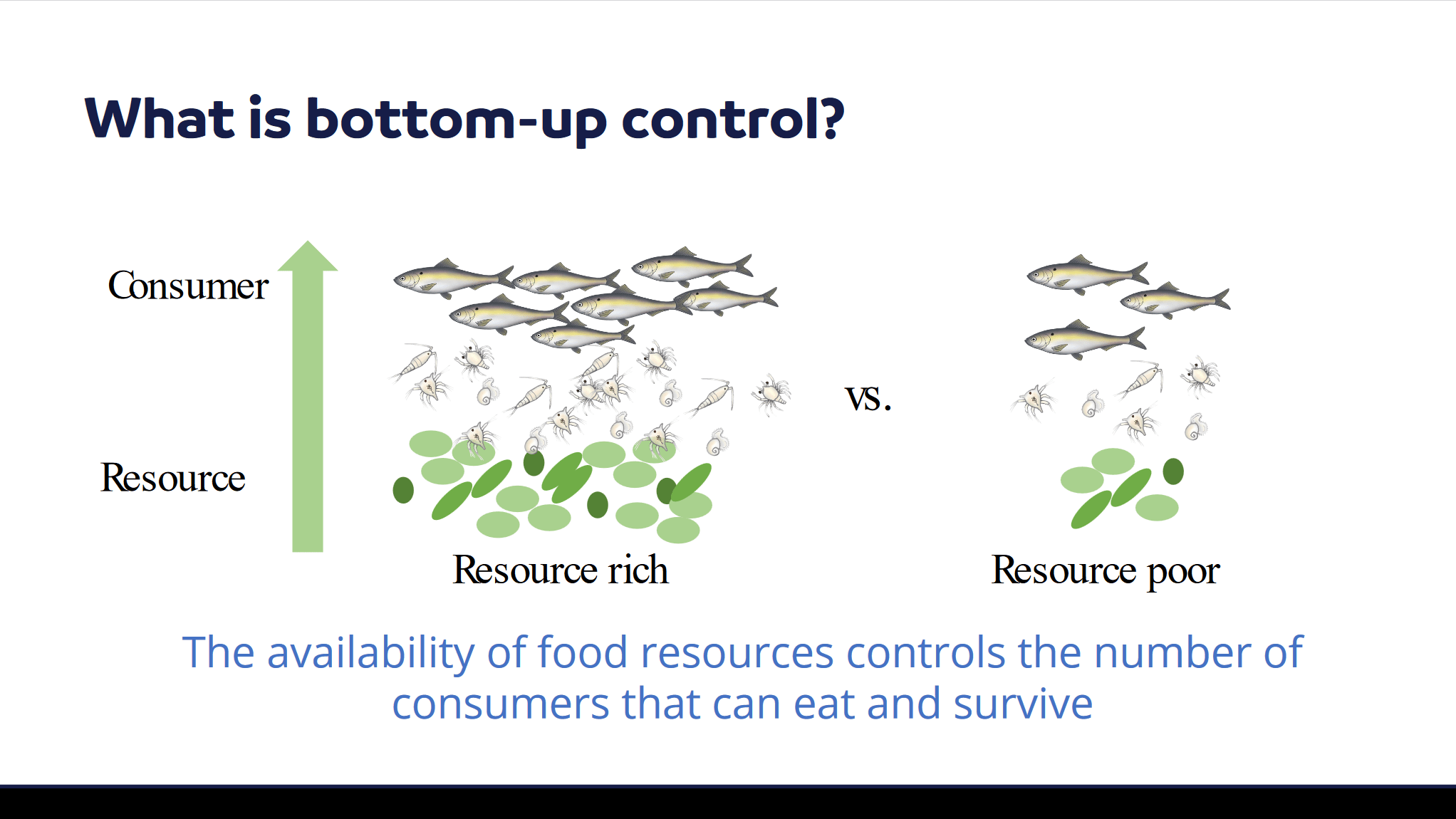 There are several hypotheses as to what is driving the Delta’s food web. Top-down control refers to the number of predators in the system, such as large striped bass, controlling the number of prey through direct consumption. Bottom-up control is when the availability of food resources, such as phytoplankton, tiny organisms that make up the base of the food web, are controlling the number of consumers, such as zooplankton or forage fish. An alternative hypothesis is that the environment may control organisms through direct effects based on physiology, such as tolerance to salinity or temperature.