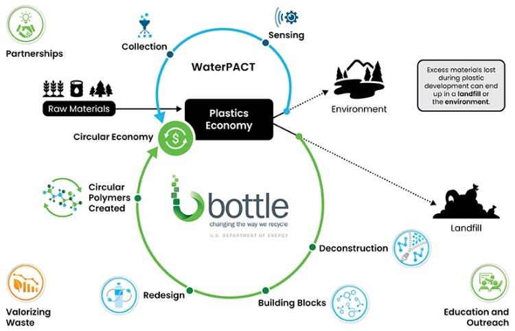 WaterPACT was initially funded by a small grant from DOE’s Bioenergy Technologies Office (BETO) and is currently funded in part by WPTO. BOTTLE is funded by BETO and DOE’s Advanced Materials & Manufacturing Technologies Office.