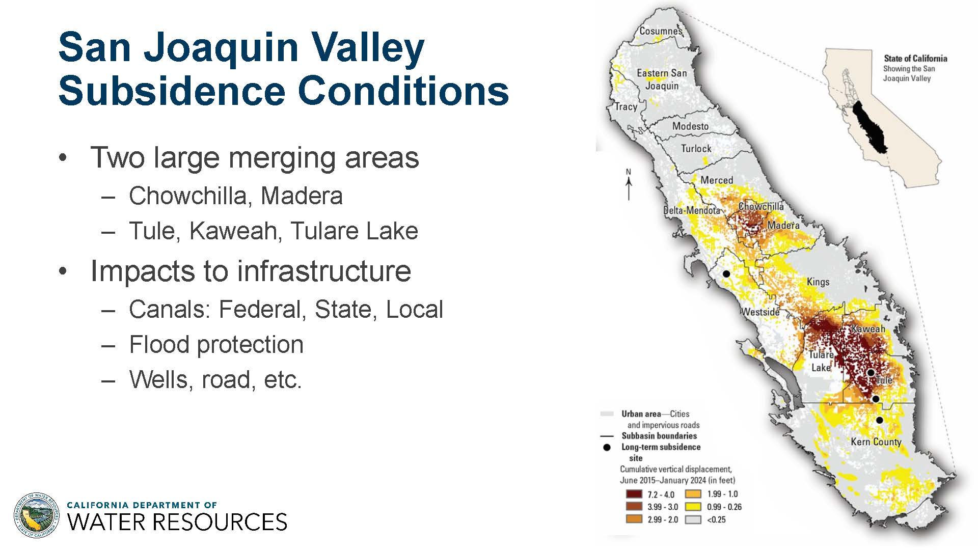 The graphic on the slide illustrates the extent of subsidence in the San Joaquin Valley since SGMA’s enactment in 2015. In some areas, subsidence has reached as much as seven feet over the past decade. Two primary areas of concern, or “bowls” of subsidence, have been identified: one near the Chowchilla and Madera region, and another spanning the Tulare Lake, Kaweah, and Tule sub-basins.
