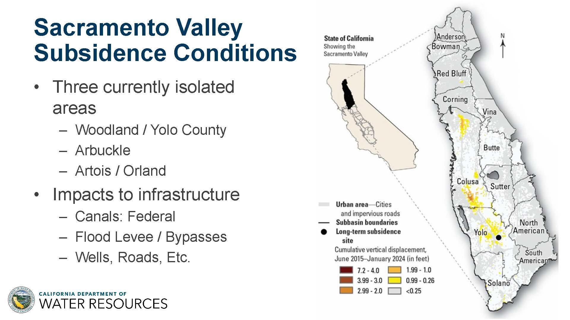 While the extent of subsidence here is less severe than in the San Joaquin Valley—measuring around two to three feet—it still poses significant challenges. This subsidence is impacting critical flood infrastructure, as well as wells, roads, and other essential systems.