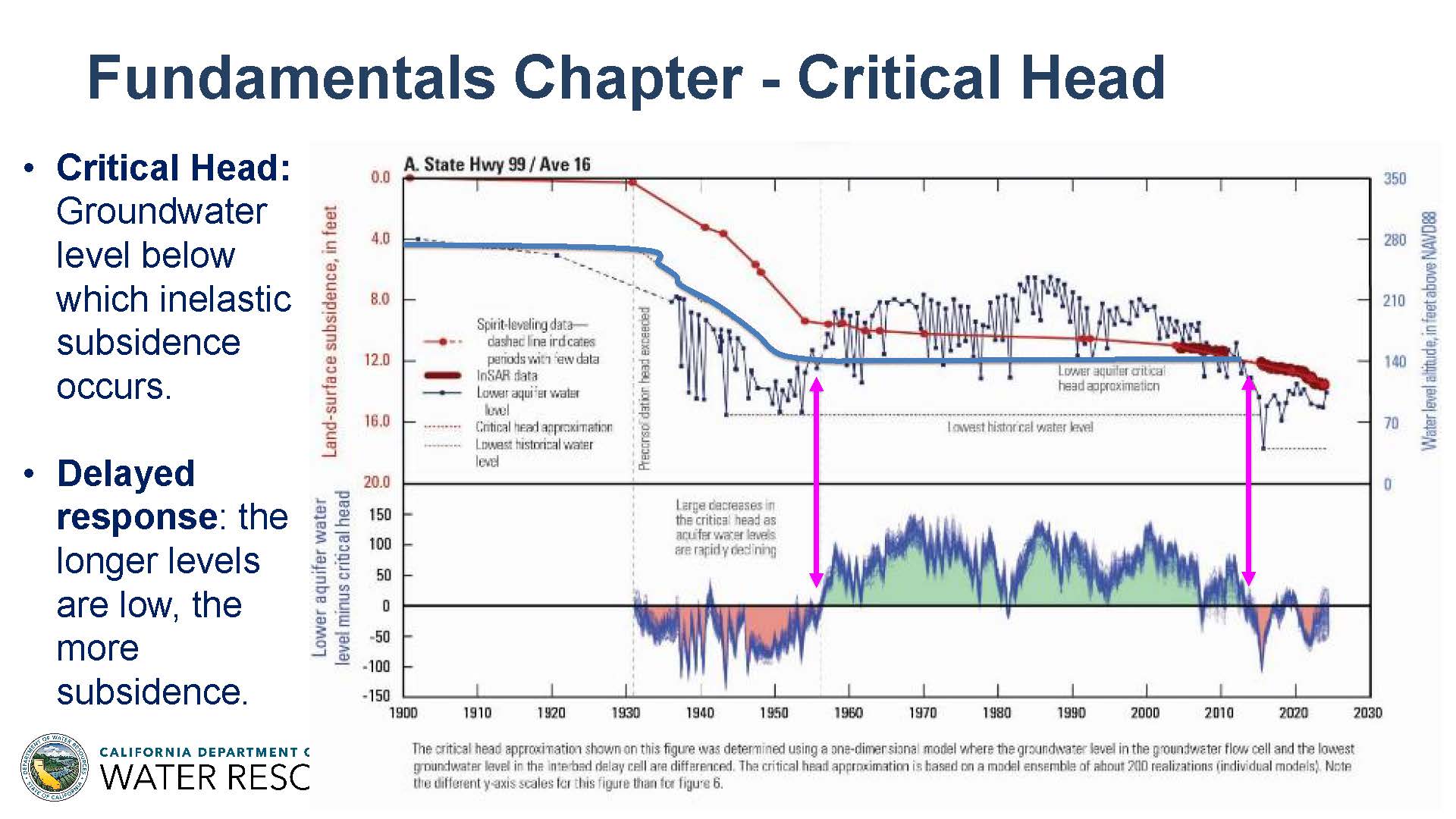 “So from about 1955 to about 2015, we were seeing residual subsidence, but that inelastic, active subsidence was no longer occurring because groundwater levels are above that critical head value,” said Mr. Edmunds. “Once again, in 2015 with the onset of the most recent drought, water levels once again dipped below critical head, and inelastic subsidence resumed. So this is a complicated figure, but it’s a core concept of the BMP is that if you manage water levels at or above critical head, inelastic subsidence will not be occurring.”