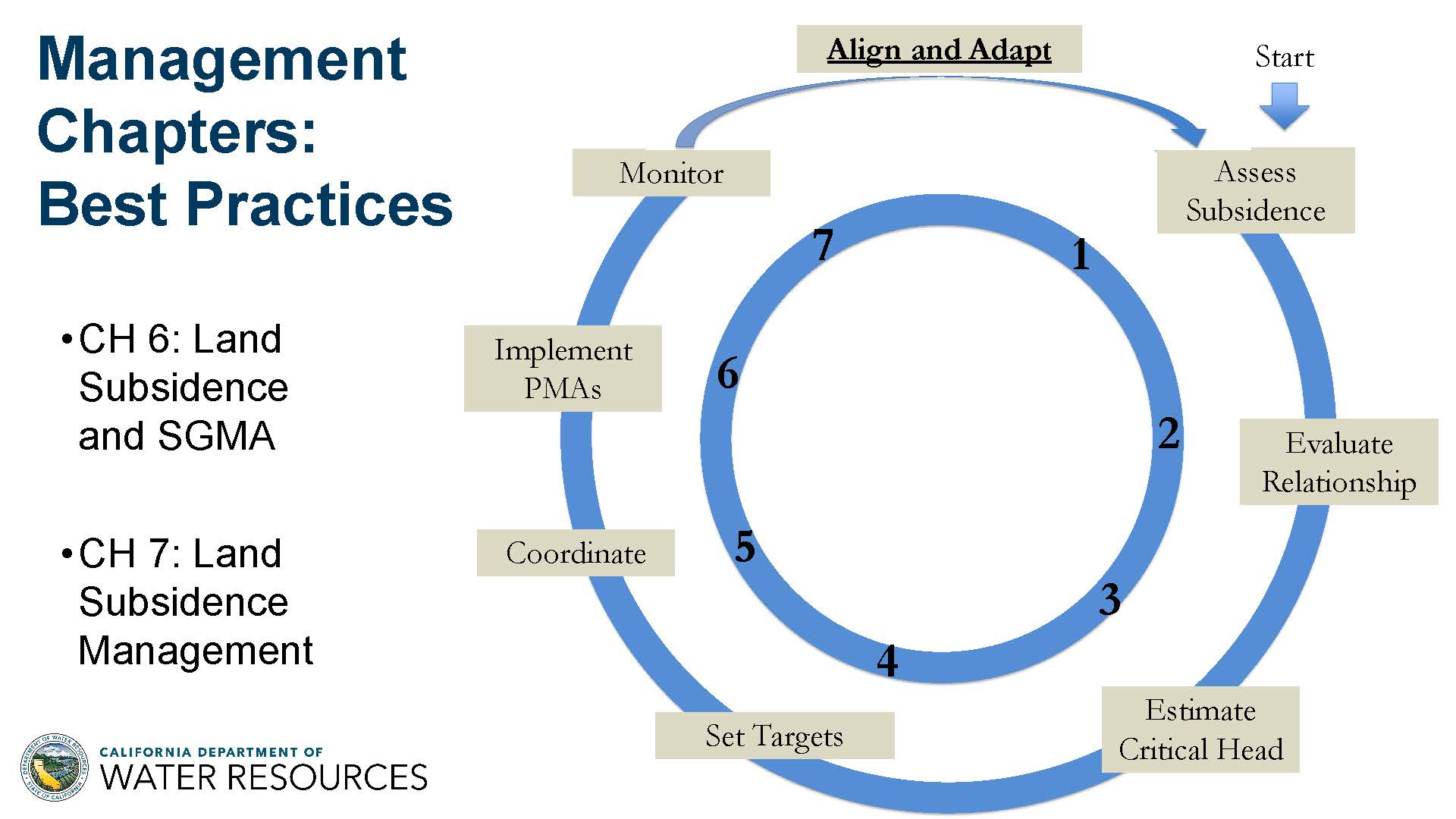 Two chapters in the BMP are dedicated to management strategies. Chapter 6 focuses on land subsidence within the framework of the Sustainable Groundwater Management Act (SGMA), while Chapter 7 provides a broader approach to land subsidence management, including an adaptive management strategy.
