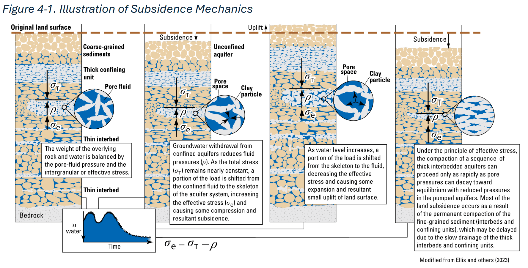 Compaction: The figure in the upper right provides a simplified illustration of compaction. When water is removed from the ground, fine-grained sediments collapse, leading to a lowering of the land surface elevation.