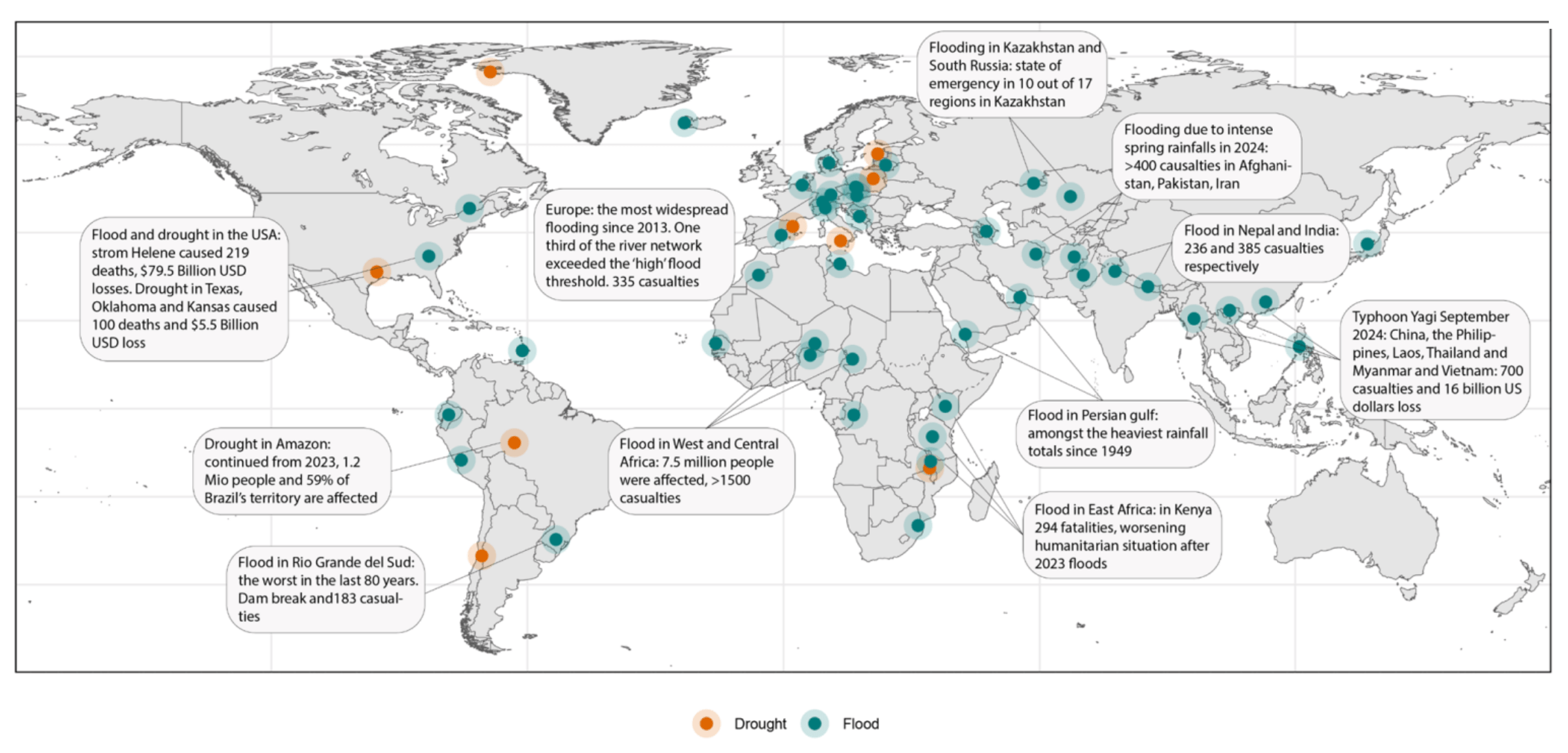 Extreme Events: Africa’s tropical zone experienced unusually heavy rainfall in 2024 compared to their historical norms, resulting in approximately 2,500 fatalities and 4 million people displaced. Europe experienced its most extensive flooding since 2013, with one-third of the river networks exceeding high flood thresholds. Asia and the Pacific were hit by record-breaking rainfall and tropical cyclones, resulting in over 1,000 deaths. Brazil experienced simultaneous extremes, with catastrophic flooding in the south of the country taking 183 lives and continuation of the 2023 drought in the Amazon basin, affecting 59% of the country’s territory.