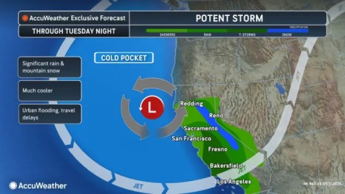 “A storm will barrel across the West Coast this week, bringing much-needed rain and some mountain snow for the first time since early spring. Showers began breaking out across Oregon and Northern California on Monday morning. Rain and high-elevation snow are forecast to expand as the storm dives southward along the Pacific coast. Widespread rainfall amounts of 1-2 inches are expected from Redding, California, to Los Angeles. “The heaviest rain will continue in the Los Angeles basin into Tuesday evening,” said AccuWeather Meteorologist Brandon Buckingham. This could contribute to travel delays on the roads and at airports across the region. “On a more serious note, where torrential rain falls on steep hillsides and burn scar locations, the potential for mudslides and other debris flows will be high,” AccuWeather Senior Meteorologist Alex Sosnowski warned. … ” Read more from AccuWeather.