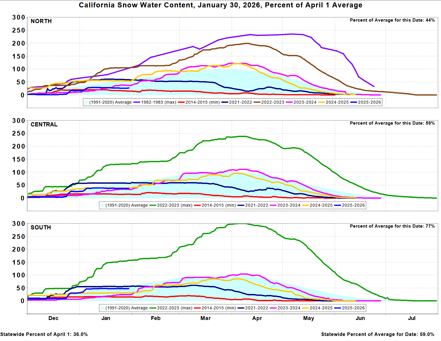 “Today, the Department of Water Resources (DWR) announced an increase to the State Water Project (SWP) allocation for 2026. The allocation is now 30 percent of requested supplies, up from the initial allocation of 10 percent on December 1. Storms in mid-December have made it possible for the SWP to increase the expected amount of water deliveries this year to the 29 public water agencies served by the SWP, which provides water to 27 million Californians and 750,000 acres of farmland. SWP allocations are based on a number of factors including hydrological conditions, existing reservoir storage, and an assumption of dry conditions through the rest of the year. The assumption of dry conditions is increasingly important given the shrinking and warming of California’s traditional precipitation season. In December, all of California benefited from winter storms. However, January has been unseasonably dry and warm and, as a result, snowpack and precipitation are below average for this time of year. … ” Read more from DWR (includes statements from the State Water Contractors and Metropolitan Water District).
