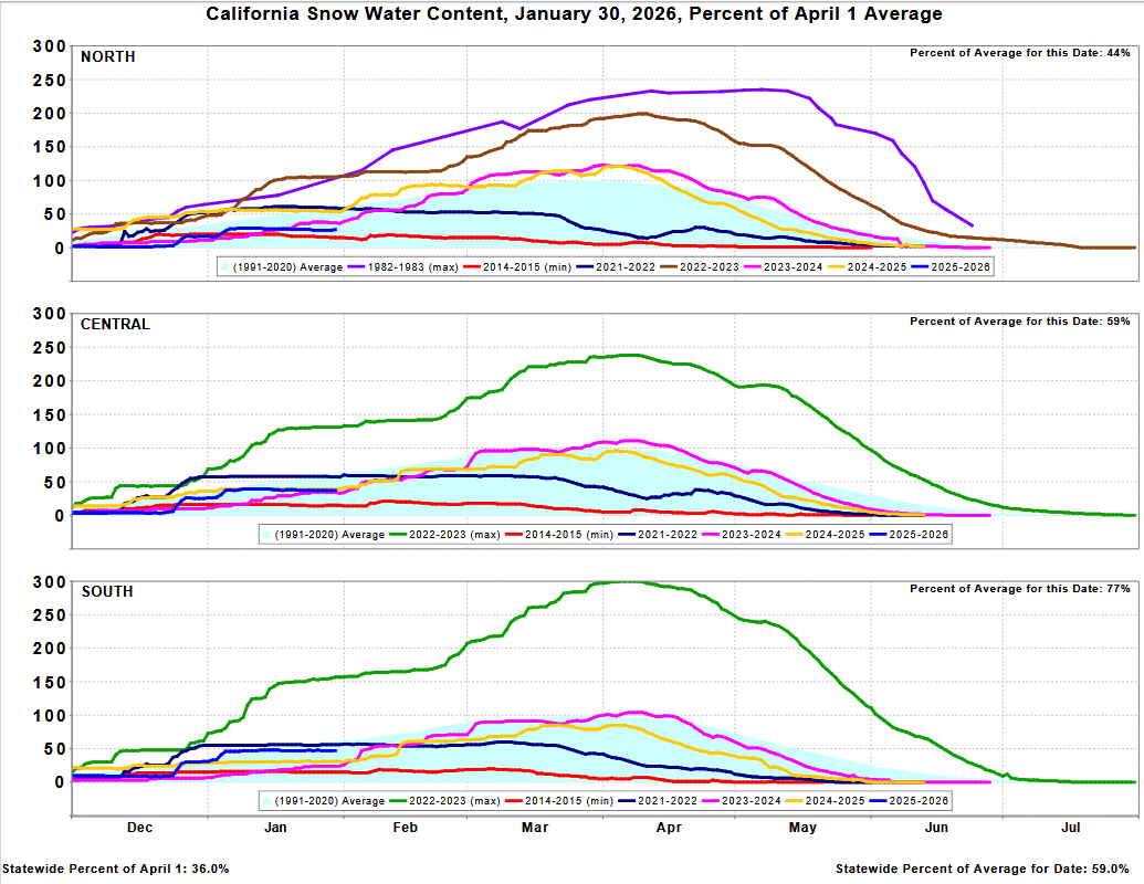 DWR: Dry January cuts into early-season snowpack gains: Statewide, the snowpack is 59%