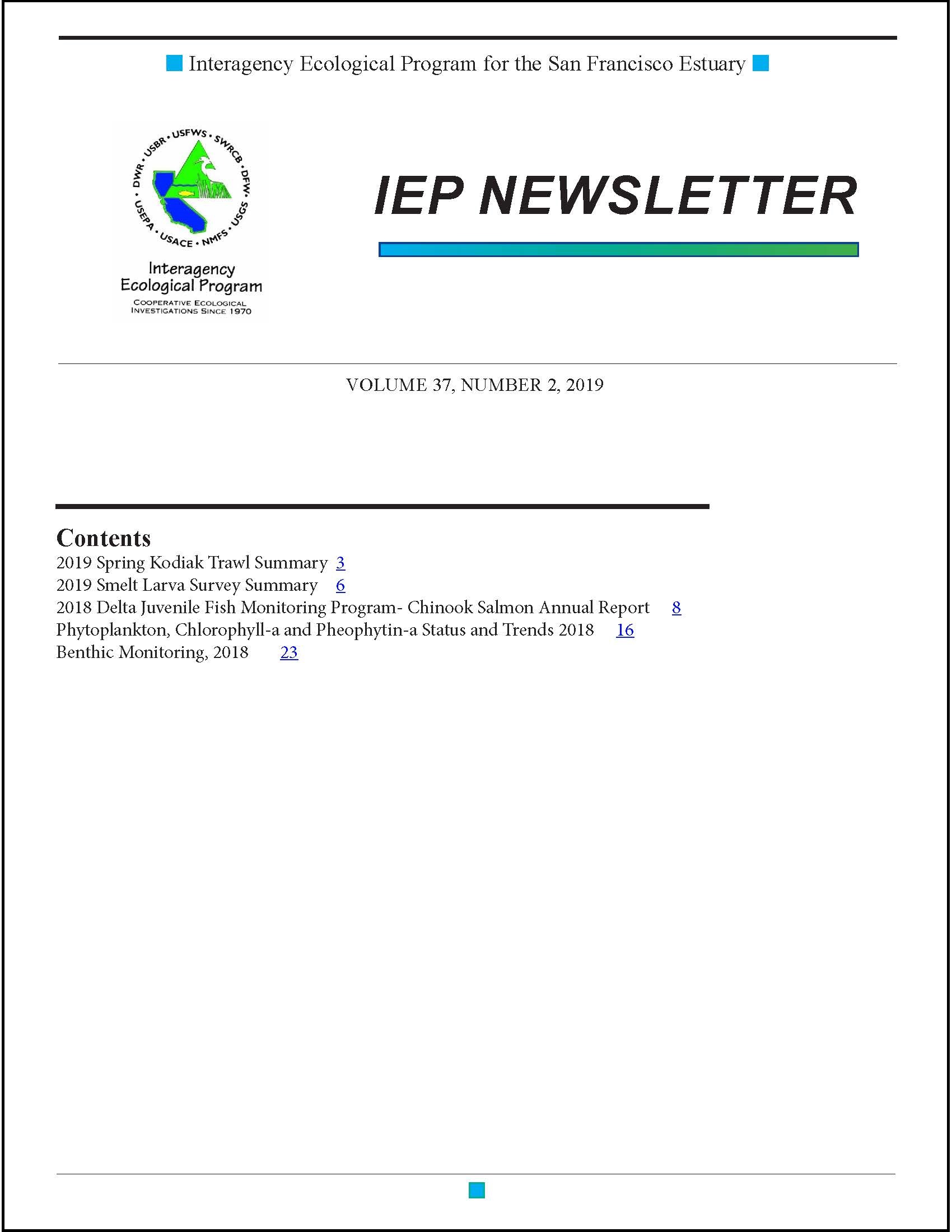 This edition of the IEP Newsletter contains the following articles: 2019 Spring Kodiak Trawl Summary 2019 Smelt Larva Survey Summary 2018 Delta Juvenile Fish Monitoring Program-Chinook Salmon Annual Report Phytoplankton, Chlorophyll-a and Pheophytin-a Status and Trends 2018 Benthic Monitoring, 2018...